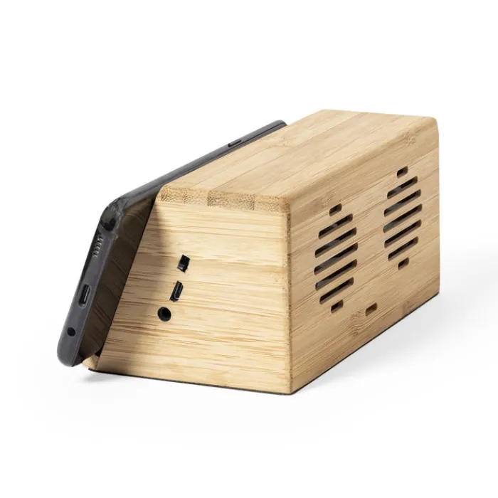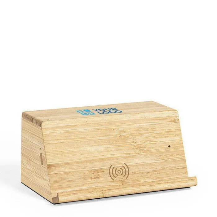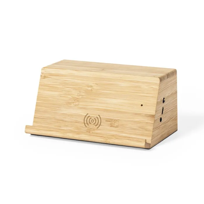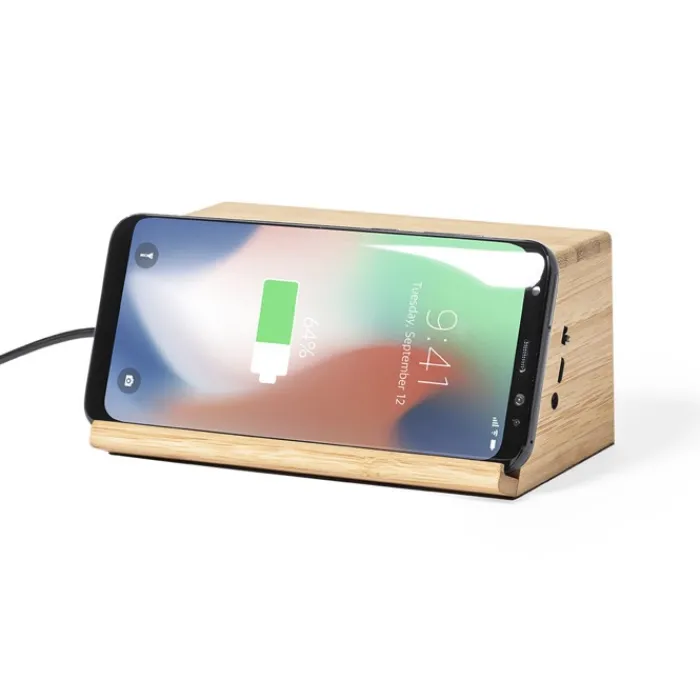 Supporto per smartphone in legno di bambù con base antiscivolo, che include un caricabatterie wireless da 10W e 2 altoparlanti da 3W ciascuno. Compatibile con i dispositivi dotati di tecnologia di ricarica wireless e ricaricabile tramite cavetto USB che viene incluso. Confezionato in un’attraente scatola di eco-design.