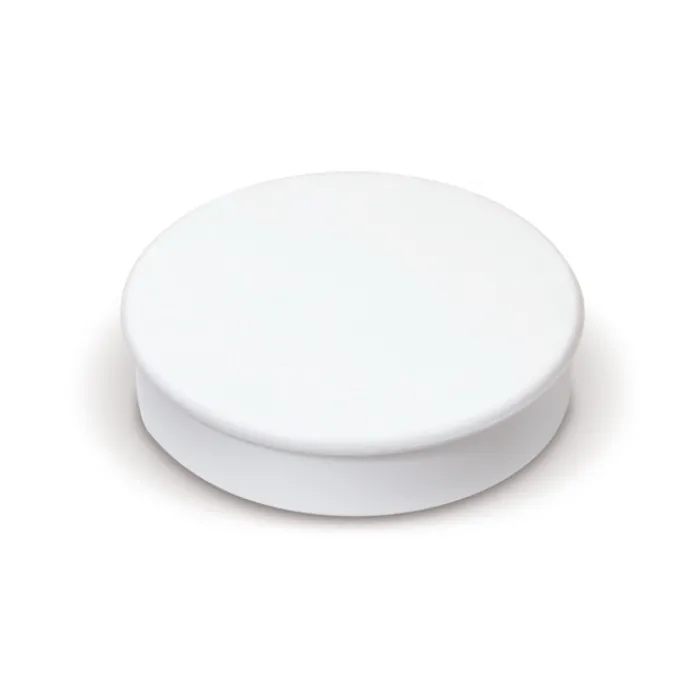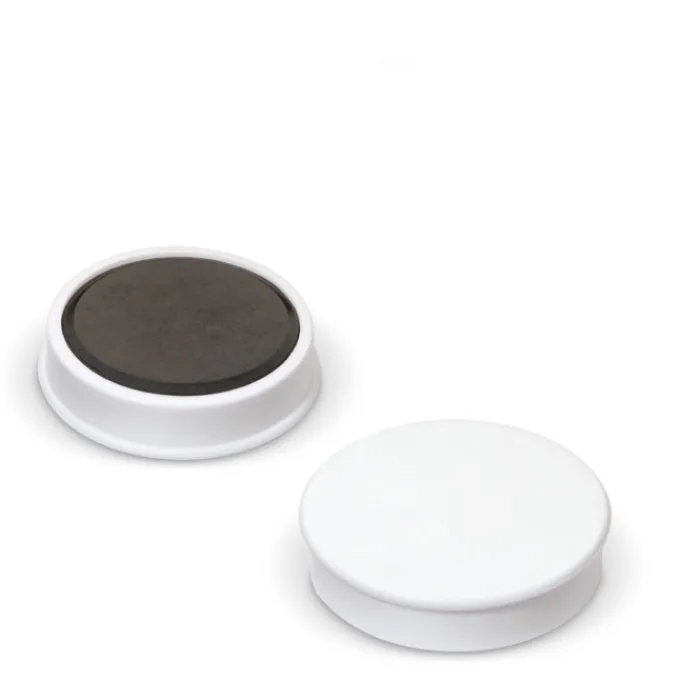 Calamita rotonda in plastica e ferrite. Può tenere fino a 9 fogli A4 medi. Diametro: 36mm. N9,5.