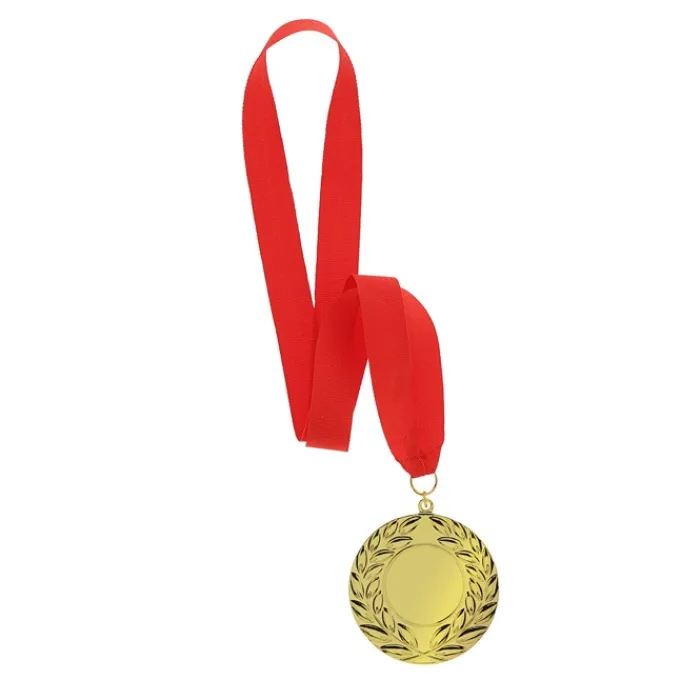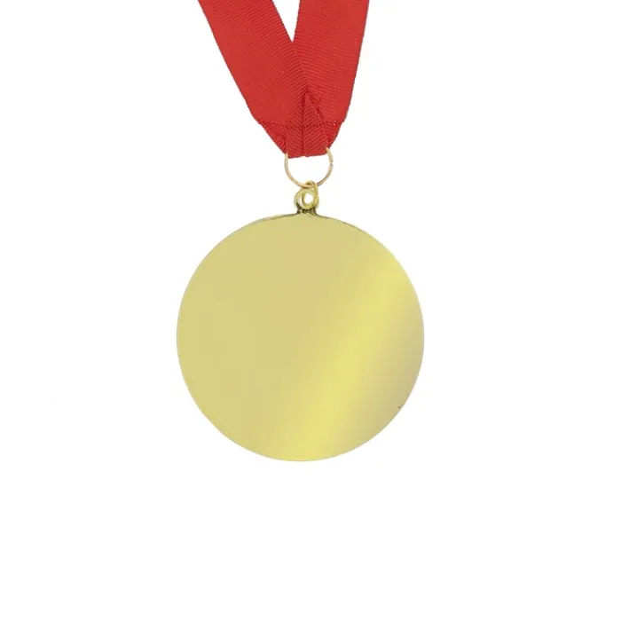 Medaglia metallica con finitura dorata in rilievo di 7 cm di diametro. Con nastro in poliestere di colore rosso, anello metallico abbinato e progettata specificamente per marcatura laser.