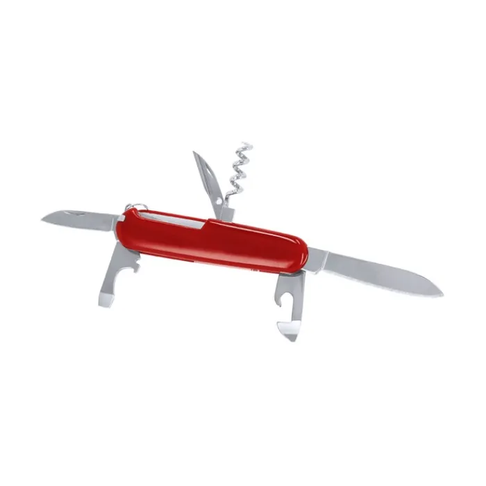 Coltello multiuso con accessori in acciaio inox con 8 funzioni, con rivestimento in resistente ABS. Include due coltelli di diverse dimensioni, punteruolo, cavatappi, ago da cucire, stuzzicadenti, apribottiglie e apriscatole.