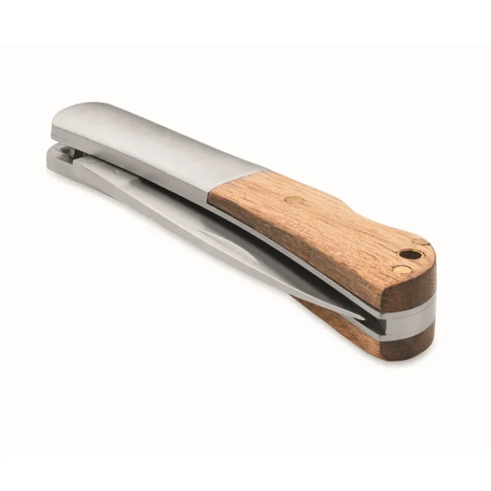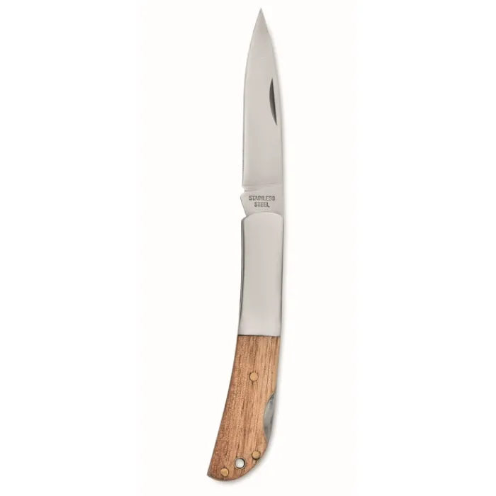 Coltellino pieghevole in acciaio inox con manico in legno di acacia.