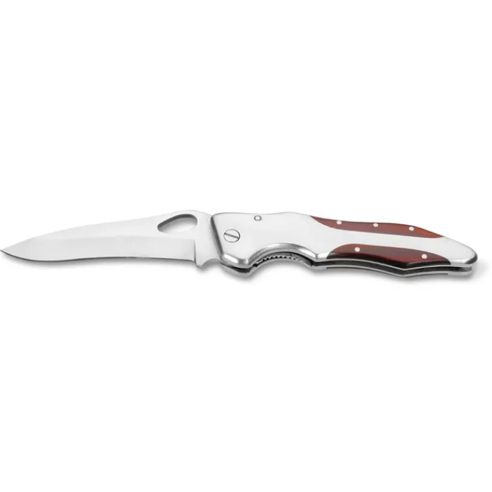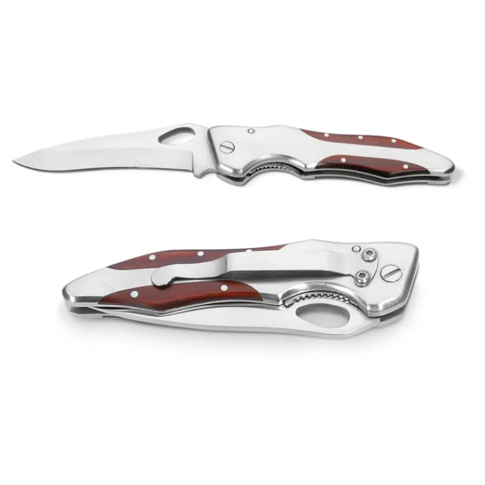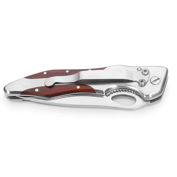 Coltellino tascabile in acciaio inox e legno con chiusura di sicurezza e clip.