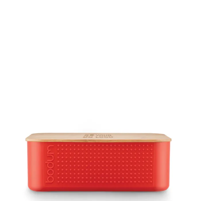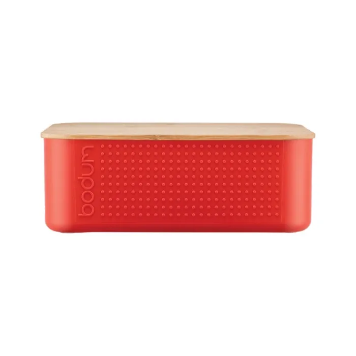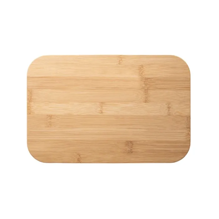 Contenitore per alimenti in plastica, privo di BPA, con coperchio in bambù dotato di scanalature che può fungere anche da tagliere o vassoio per servire il pane. Lavabile in lavastoviglie senza coperchio. Fornito con una fascia di cartone. Protezione termica. Made in Europa.