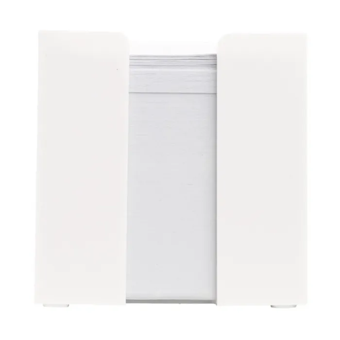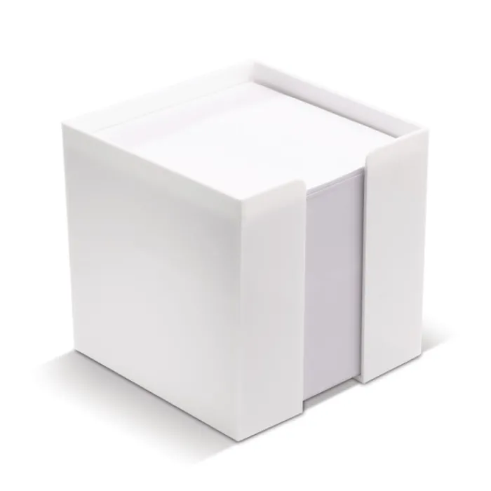 Cubo di plastica bianco porta notes completo di 800 foglietti di carta senza legno bianca da 90g/m². Confezionato singolarmente.