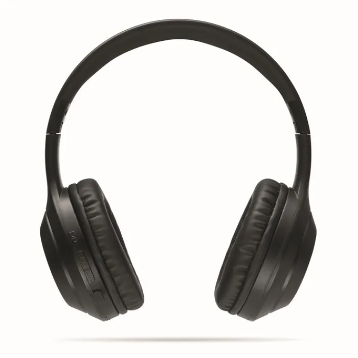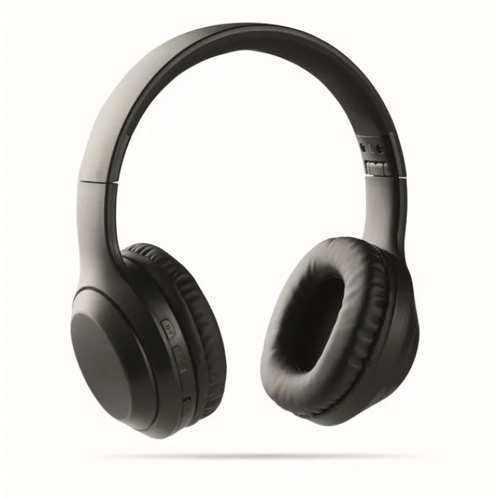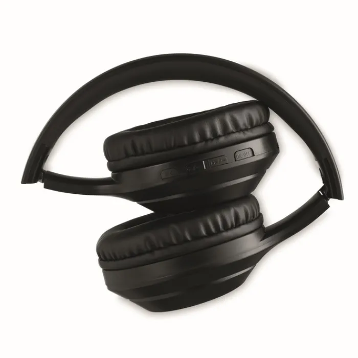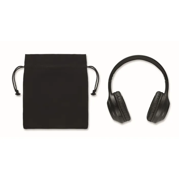 Cuffie pieghevoli wireless 5.0 in ABS presentate in un sacchetto di cotone da 140 gr/m². Batteria ricaricabile Li-Pol da 200 mAh. Funzione vivavoce e microfono integrato. Include cavetto di ricarica micro USB. Tempo di durata circa 4 ore. Portata operativa: 10 m.