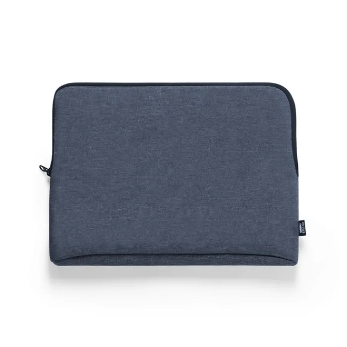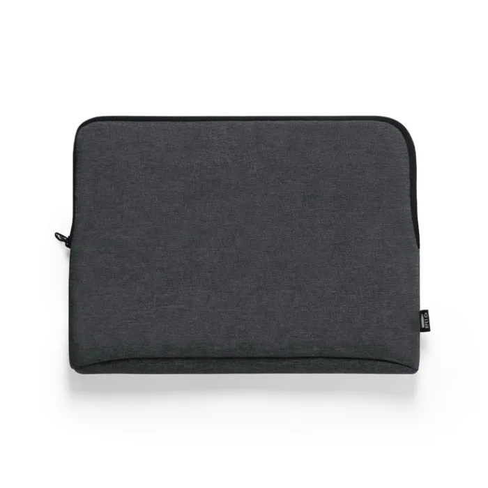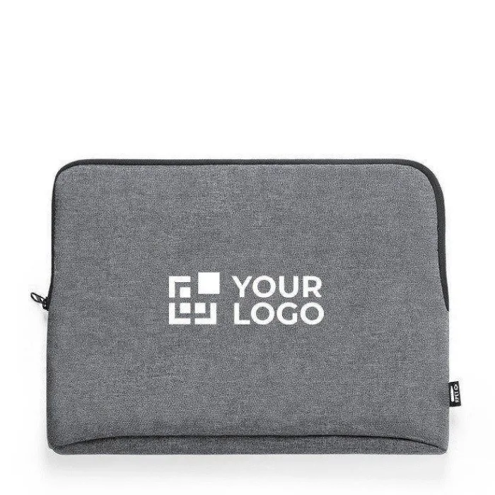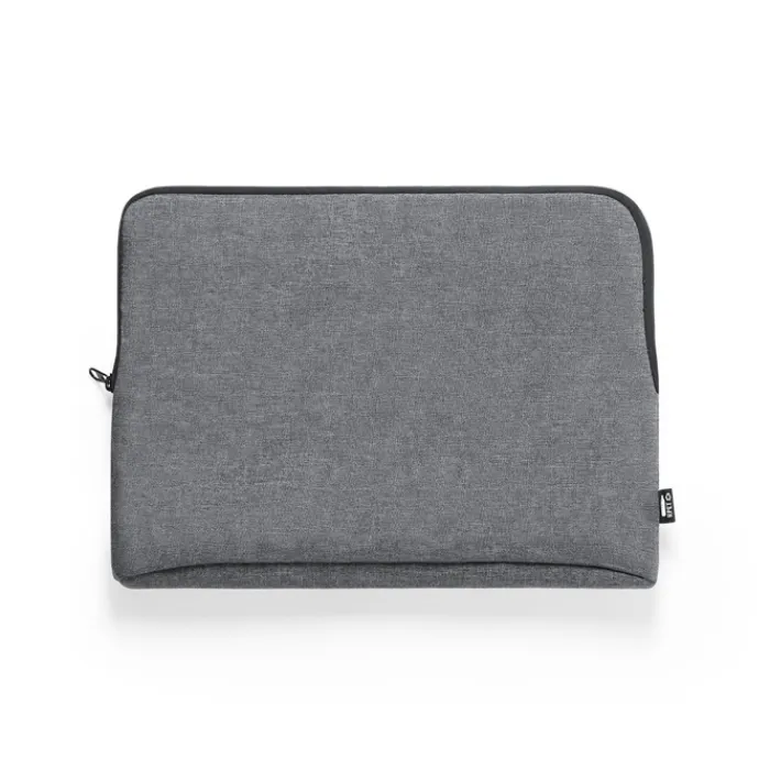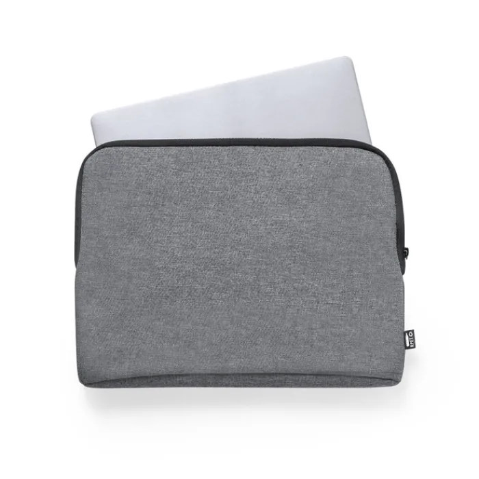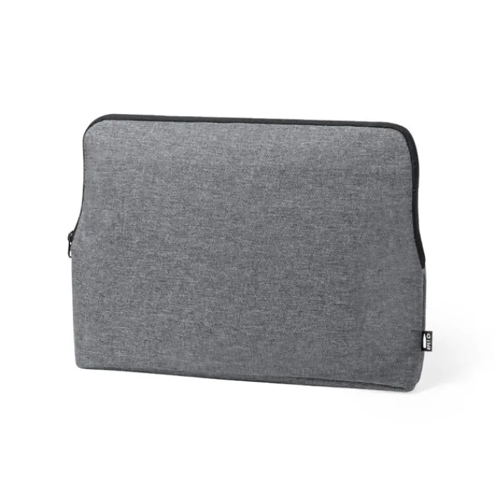 Custodia per laptop della linea Nature in resistente RPET 600D effetto melange, realizzata in plastica riciclata per favorire il riutilizzo dei rifiuti plastici e contribuire alla sostenibilità del pianeta. Dettagli neri e scomparto principale con cerniera. Interno completamente imbottito e foderato, con logo RPET sull’etichetta esterna.