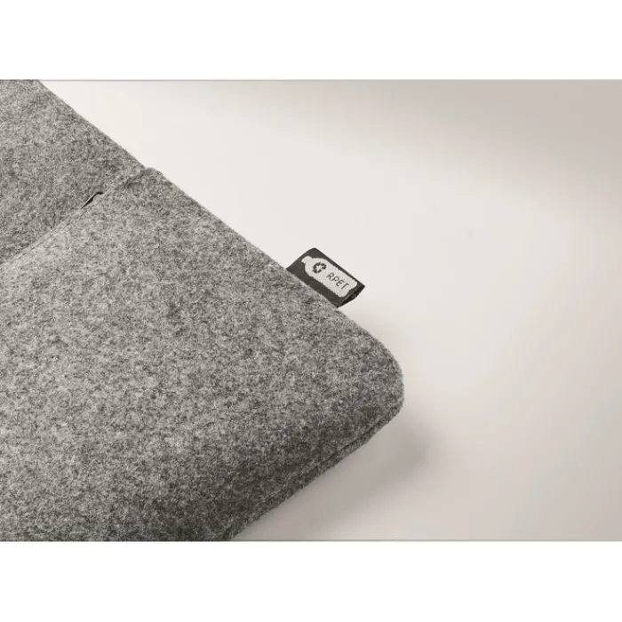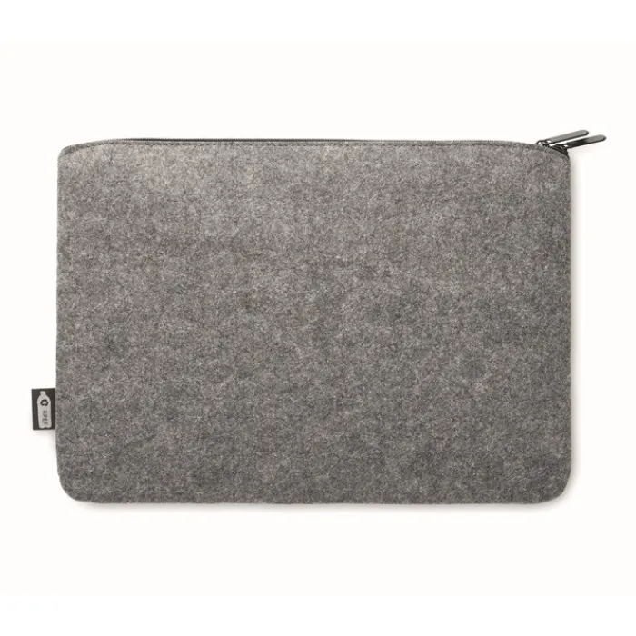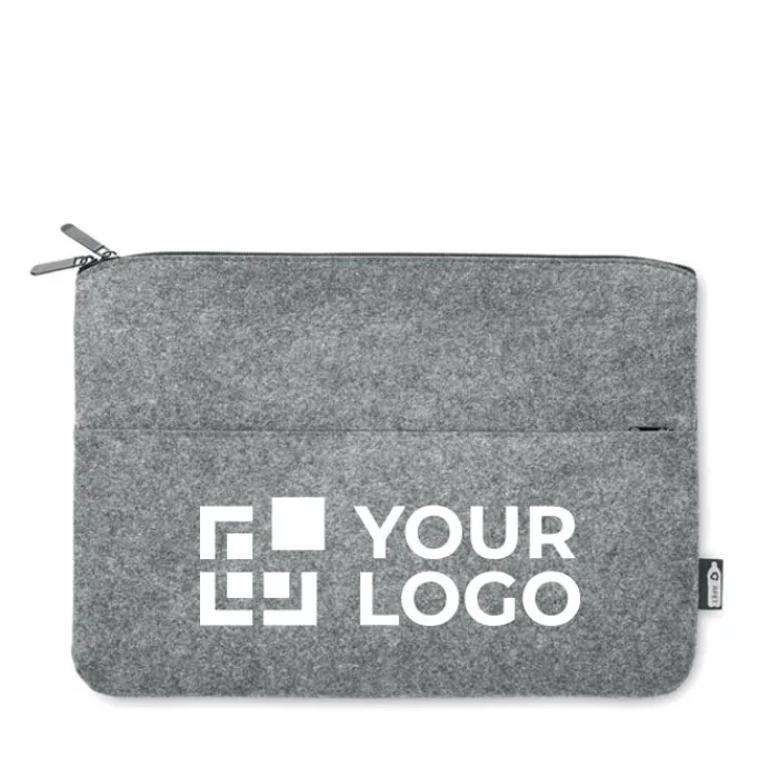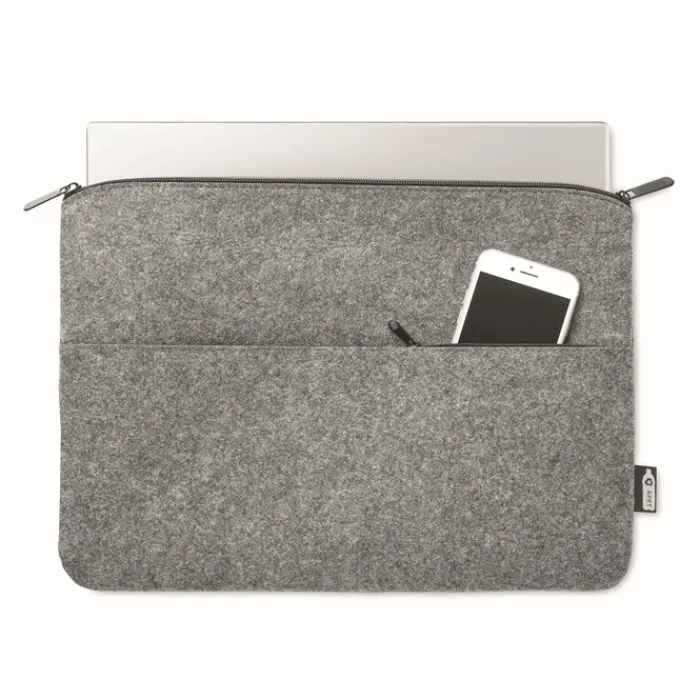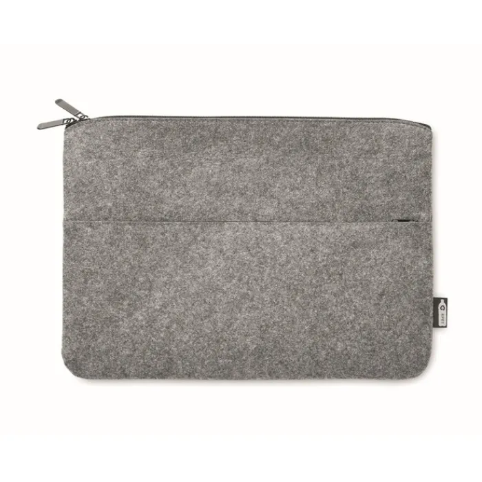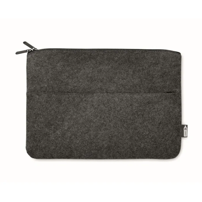 Custodia porta computer da 14 pollici, realizzata in feltro RPET e dotata anche di una tasca frontale con cerniera per riporre piccoli oggetti.