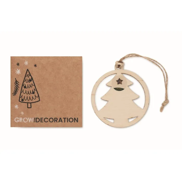 Decorazione in legno da appendere a forma di abete con cordino in juta. Include semi di abete da piantare. Presentata in una scatolina di cartone kraft. Realizzato in Europa.