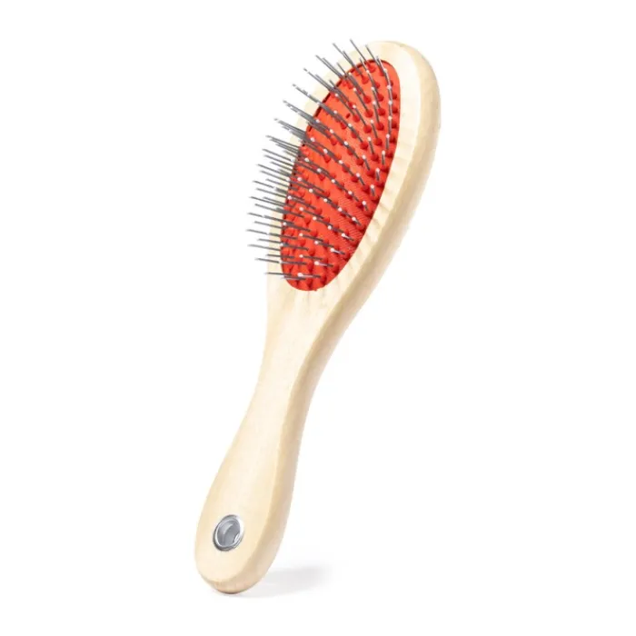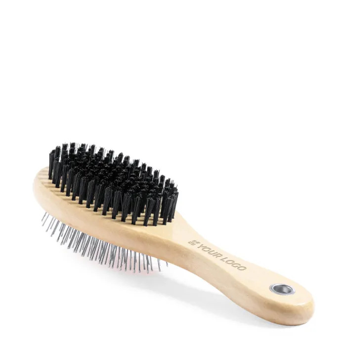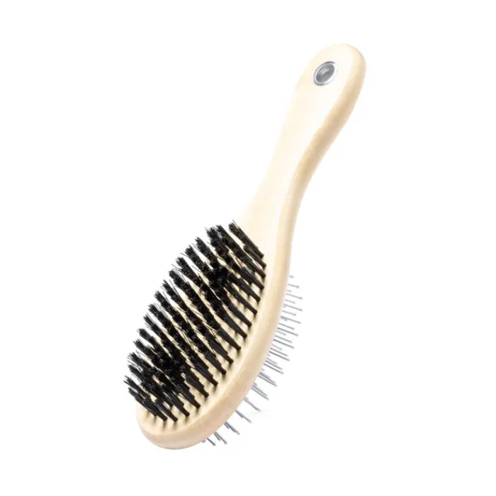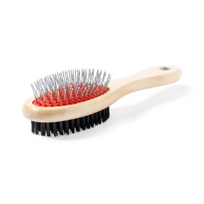 Spazzola per animali domestici con corpo in robusto legno naturale. Ha due diversi tipi di spazzole, una per lato.