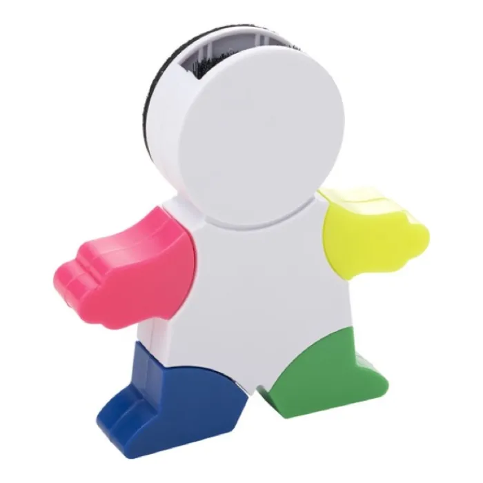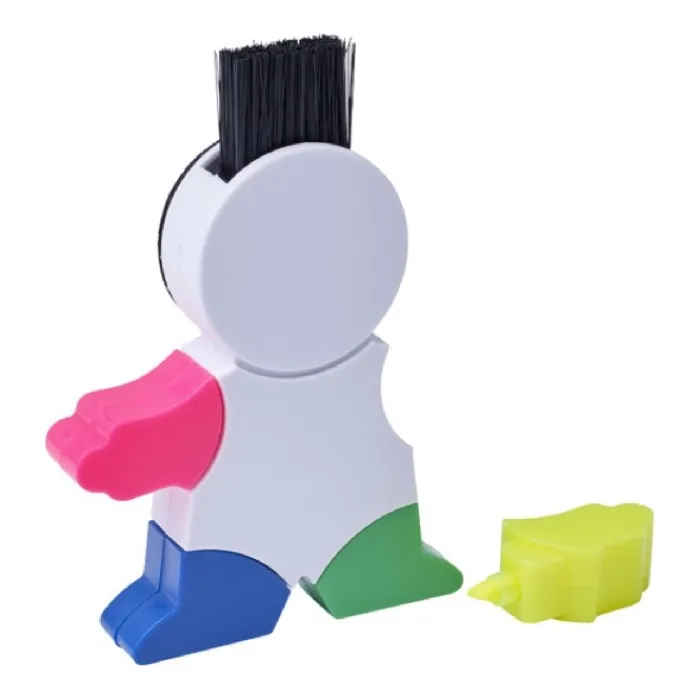 Evidenziatore in ABS a forma di omino con quattro colori: giallo, rosa, verde e blu. Include pulisci-schermo e spazzola estensibile per tastiera.