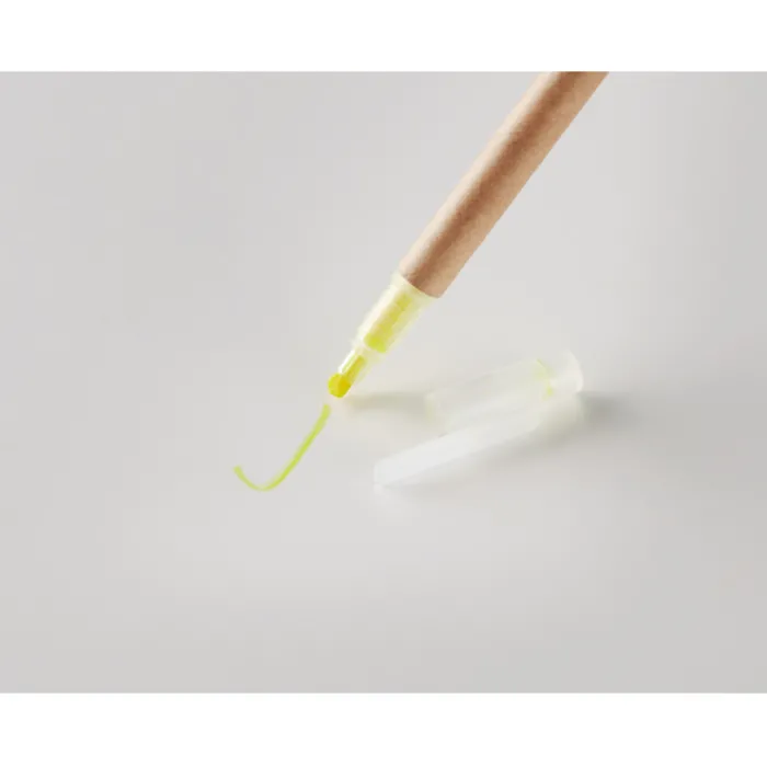 Penna in cartone con inchiostro blu ed evidenziatore giallo.