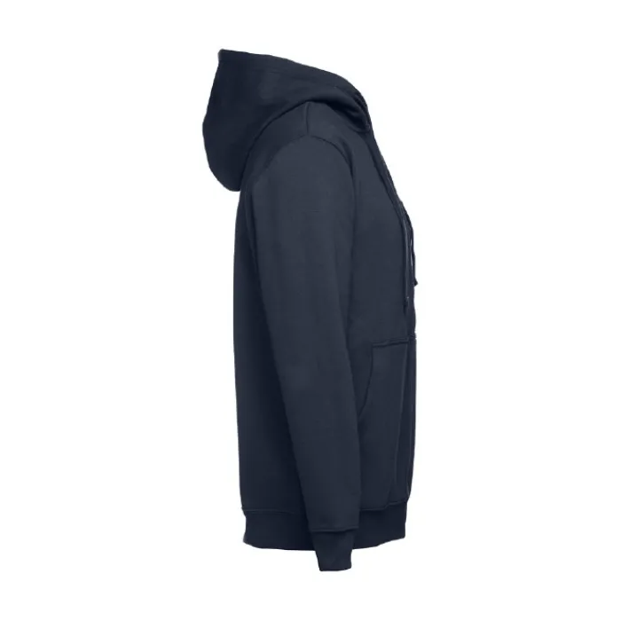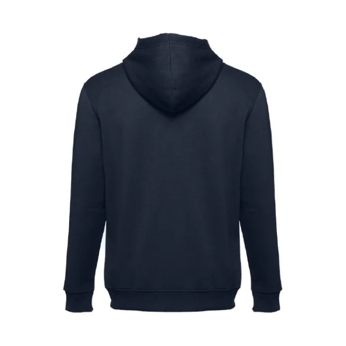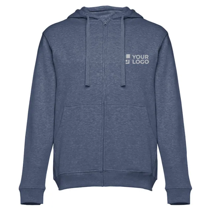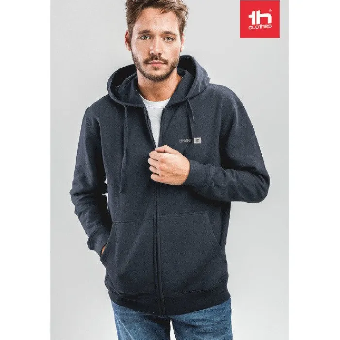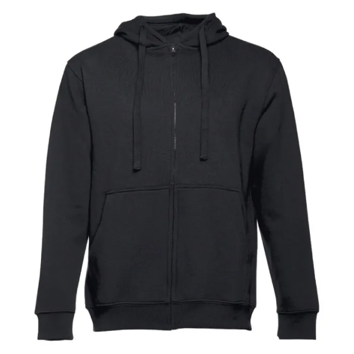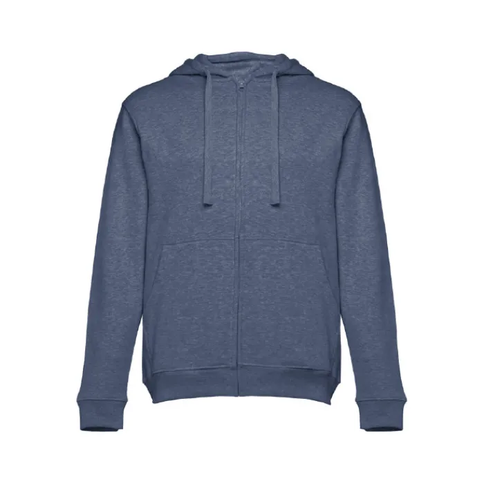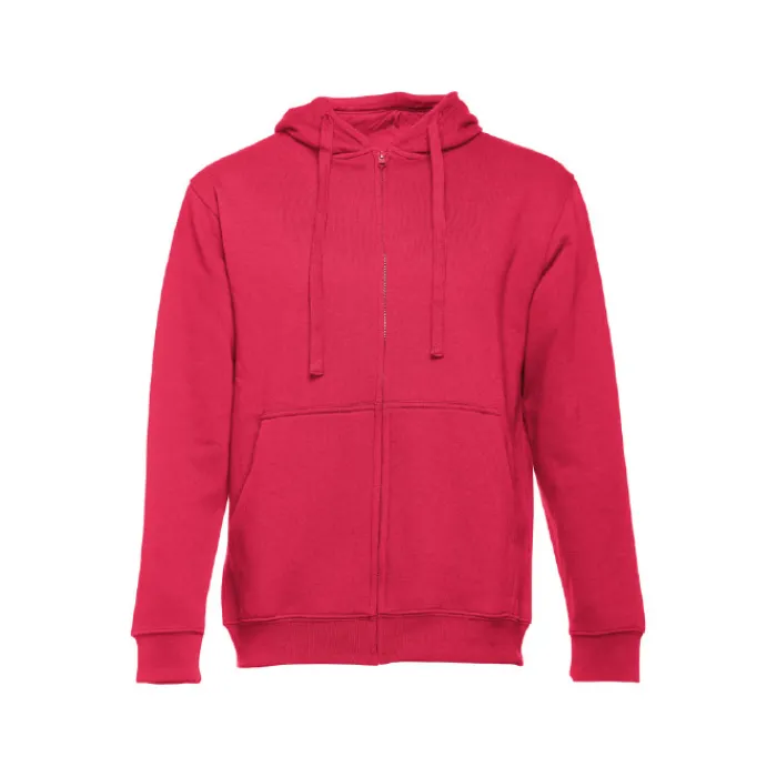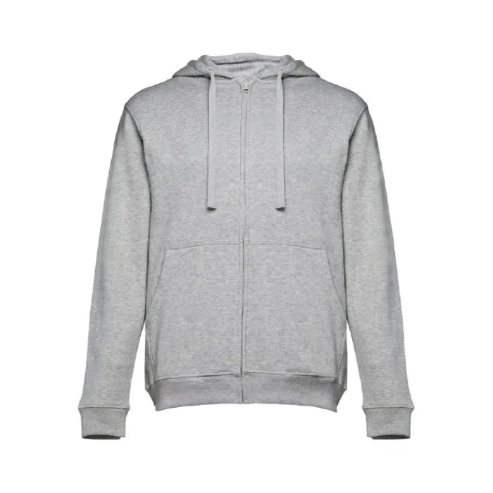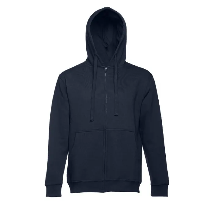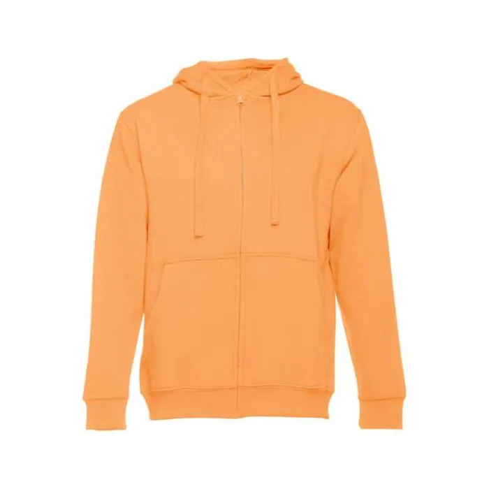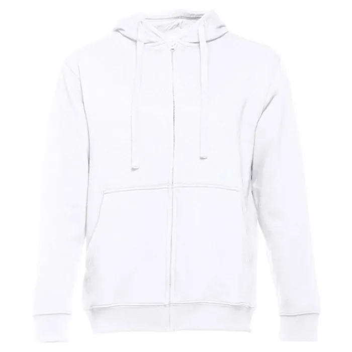 Felpa con zip e cappuccio realizzata in 50% cotone e 50% poliestere da 320 g/m² con interno spazzolato. Cappuccio con coulisse con cordoncino in tinta. 2 tasche a marsupio. Polsini e vita a costine. Taglie disponibili: S, M, L, XL, XXL.