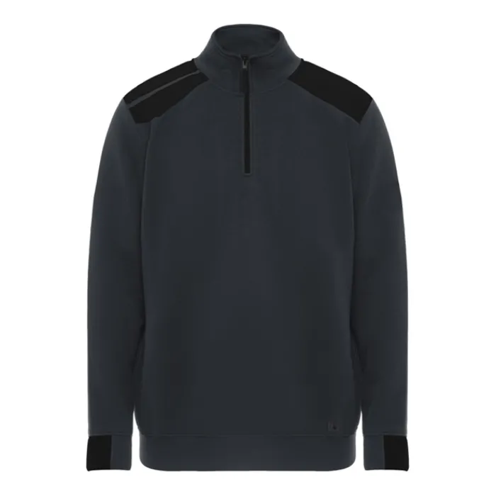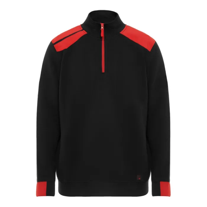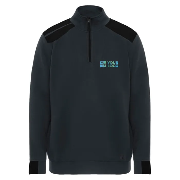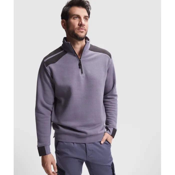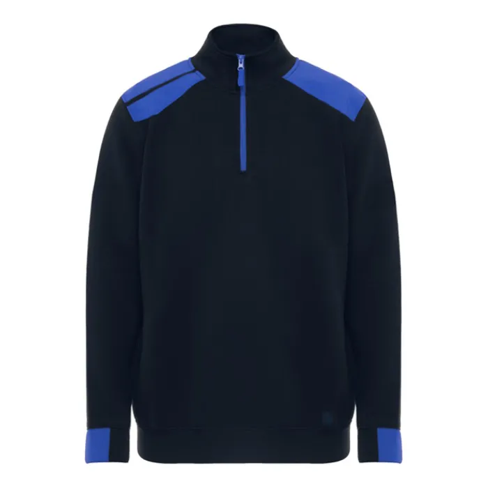 Felpa con mezza zip e collo alto in colori misti. Polsini e orlo in maglia a coste 1×1. Copertura delle cuciture rinforzate all’interno del collo. Spalle e dettagli a contrasto.