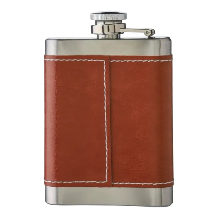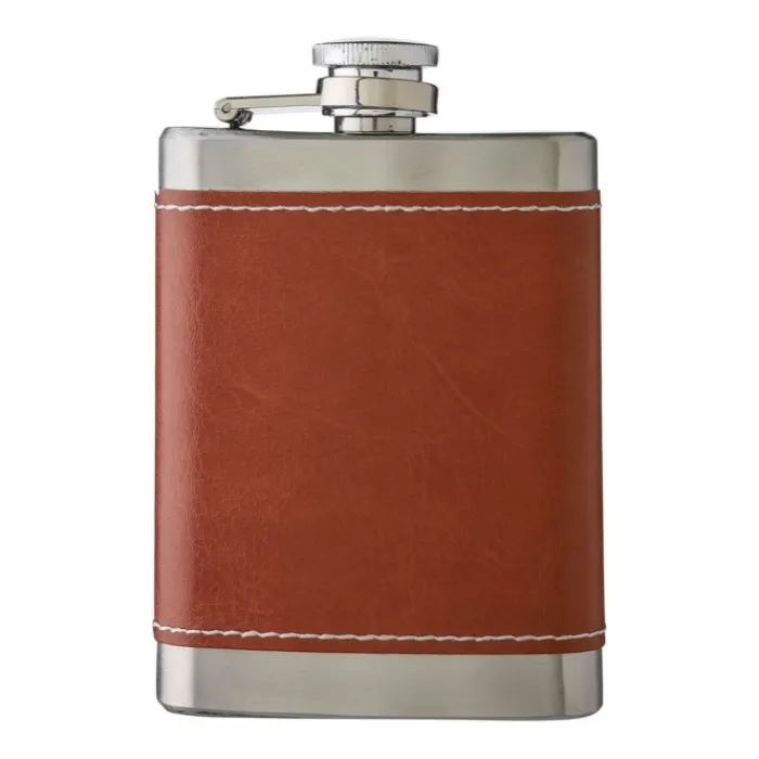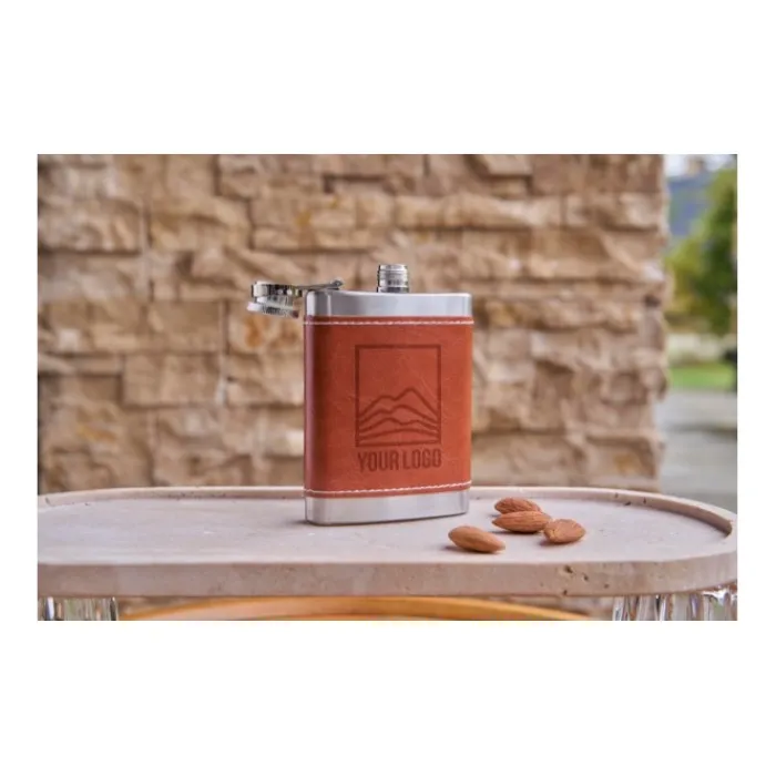 Fiaschetta in acciaio inox 304 (100 ml) con custodia in PU. Confezionata in scatola di cartone marrone.