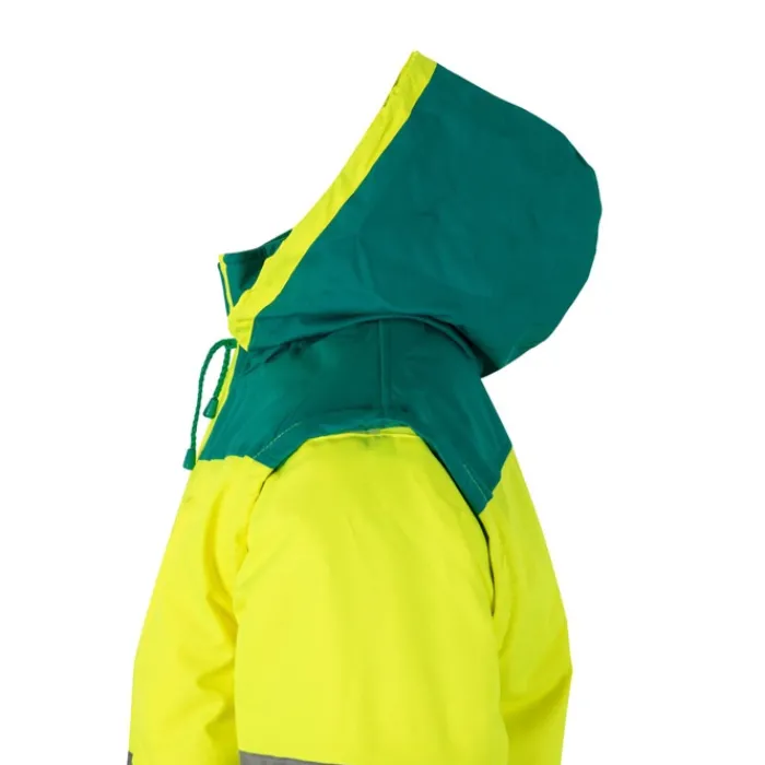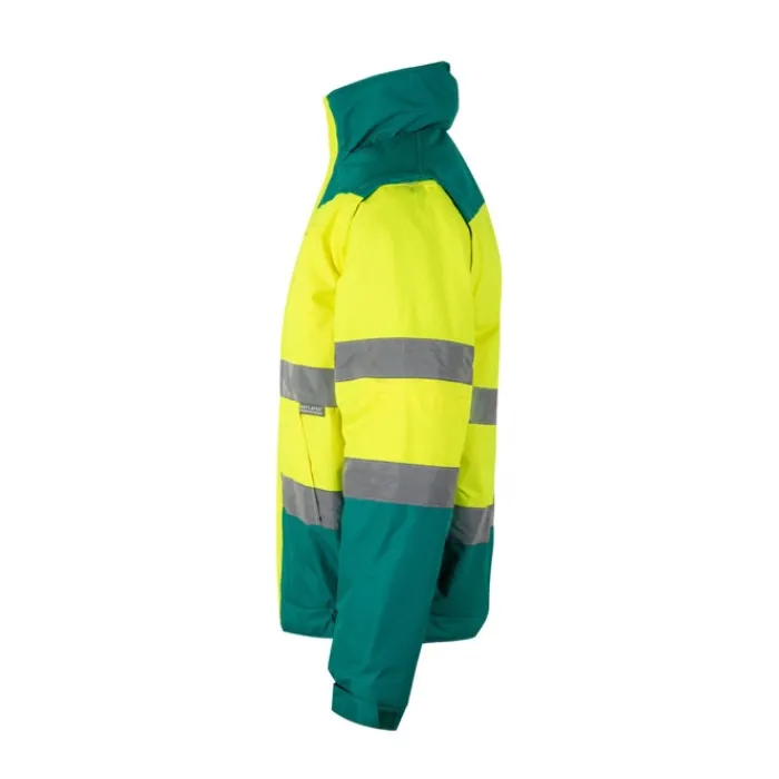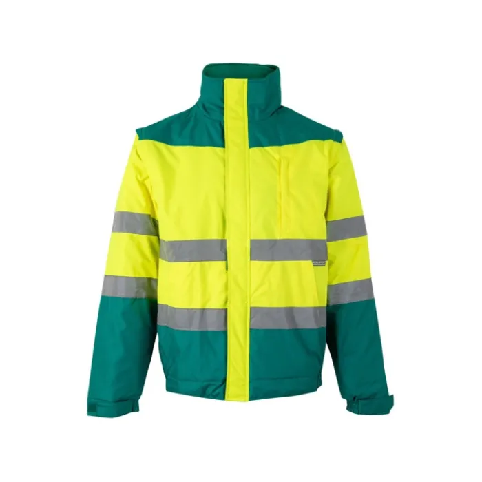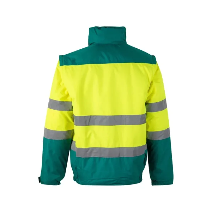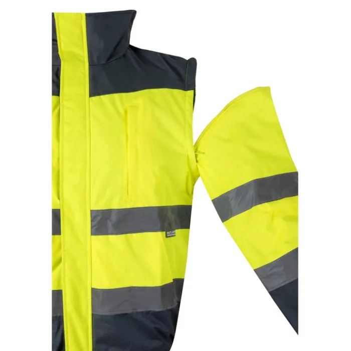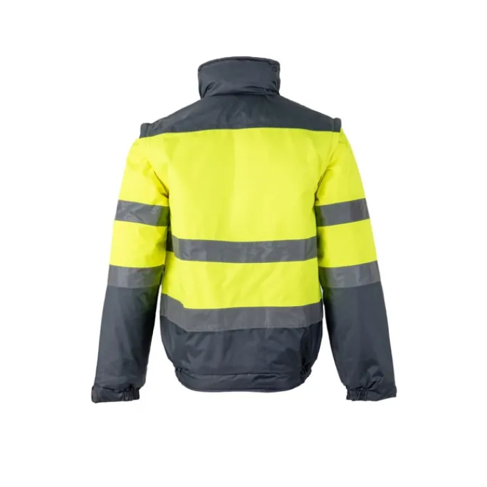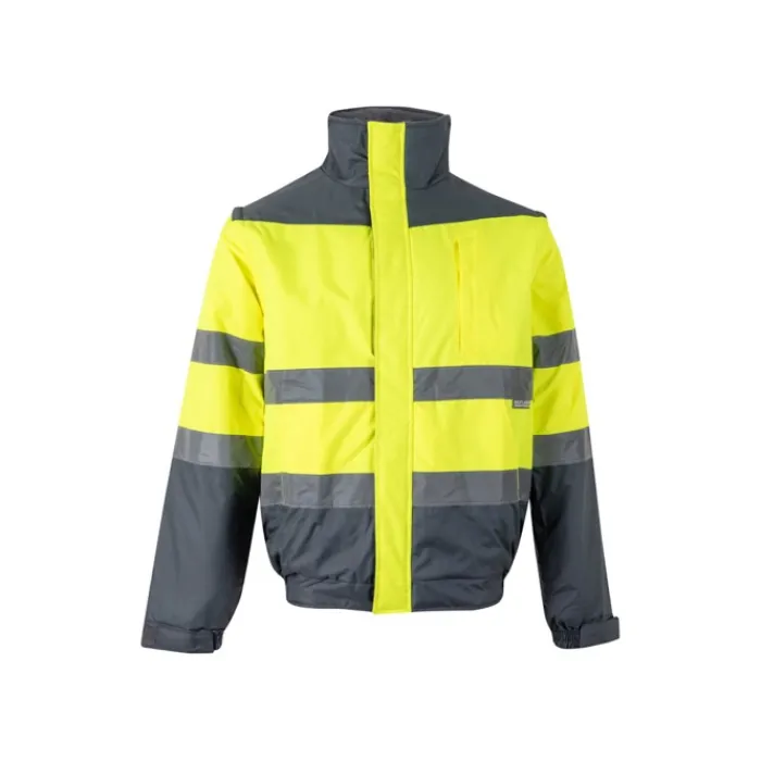 Giubbotto imbottito bicolore (180g/m²) in poliestere (100%) con rivestimento in PU. Con chiusura a zip, nascosta da pattina, che si chiude con velcro. Cintura e polsini elasticizzati sui lati. Con strisce riflettenti sul torso e sulle maniche. Cappuccio nascosto nel colletto e maniche staccabili. Cinque tasche (1 tasca sul petto, 2 tasche anteriori, 1 tasca sul braccio sinistro e 1 tasca interna)