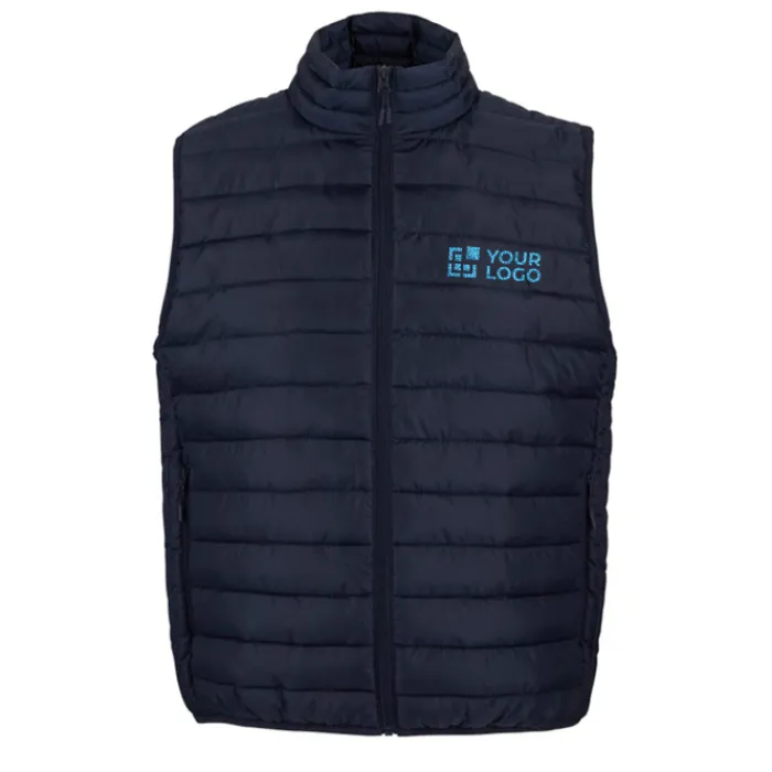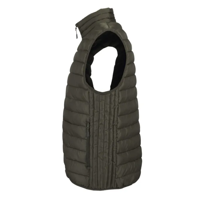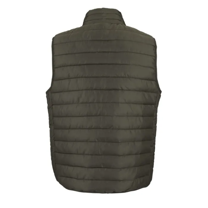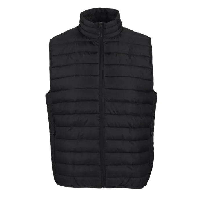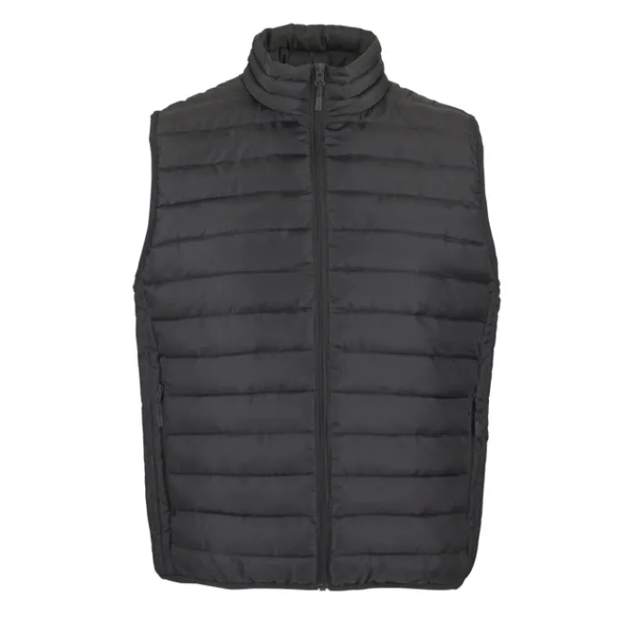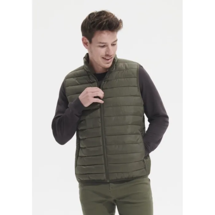 Gilè leggero da uomo con colletto alto della SOL’S. Tessuto esterno e fodera: 100% poliestere. Imbottitura: 100% poliestere piuma d’oca. Chiusura frontale e tasche laterali con zip in nylon tono su tono. Cursori in metallo tono su tono con tira zip neri fantasia. Colletto con bordino elastico in tinta sul giromanica e sul fondo. Fornito con custodia.