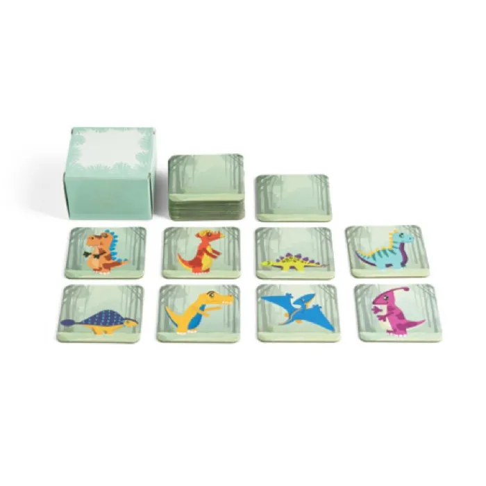 Gioco del memory composto da 20 tessere con figure di dinosauri, contenute in una scatola personalizzabile, leggera e facile da trasportare.