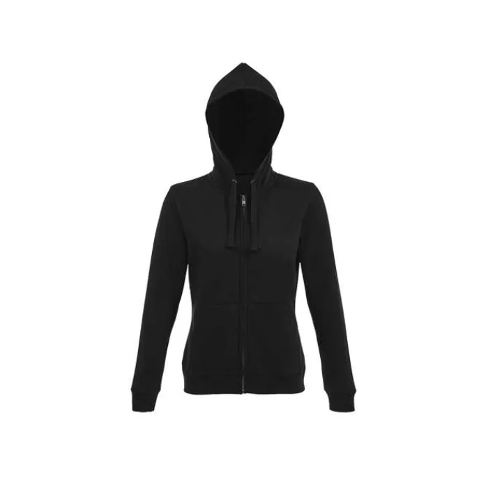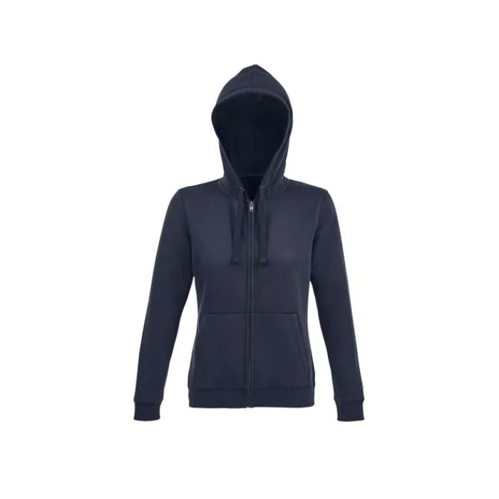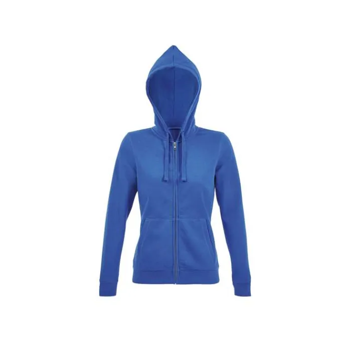 Felpa con cappuccio e cerniera intera da donna. 80% cotone ring-spun e 20% poliestere. Interno spazzolato ed esterno in 100% cotone FLEECE 280 LSF (tessuto a basso restringimento). Cuciture flatlock ai polsini, al giromanica, sul fondo del capo, sul cappuccio e sulla tasca. Rifinitura in costina 2×2 con elastan ai polsini e sul fondo del capo. 2 tasche a marsupio frontali. Cappuccio foderato in jersey con coulisse tono su tono. Polsini e orlo a coste 2×2. Interno del collo a mezzaluna. Certificazione OEKO-TEX® e PETA. Acquistabile solo con personalizzazione.