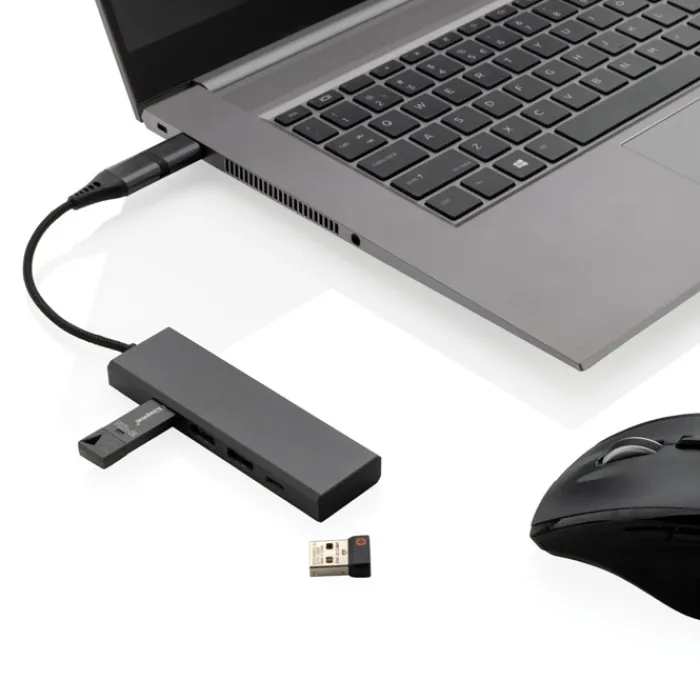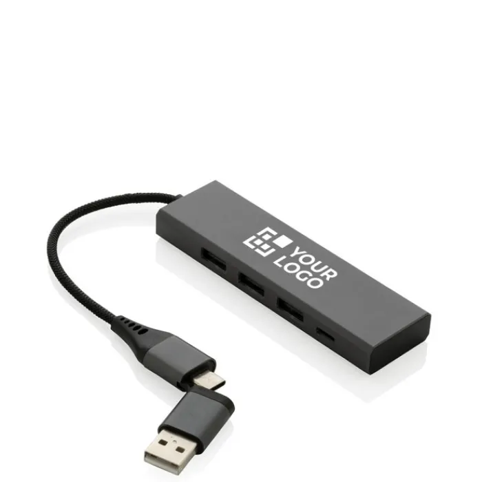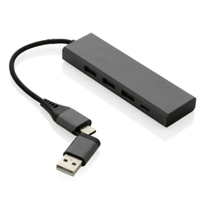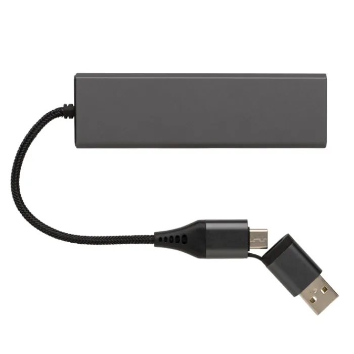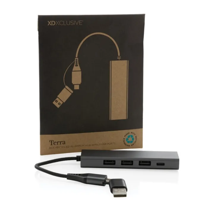 Hub USB realizzato con alluminio riciclato certificato RCS (Recycled Claim Standard), ABS, TPE e PET. Con 3 porte USB A 2.0 e 1 porta tipo C. Include doppio connettore di ingresso, quindi è adatto sia per dispositivi tipo C che USB A. L’HUB ha un cavo integrato da 10 cm realizzato con materiale TPE/PET riciclato certificato RCS. Contenuto totale riciclato: 75% in base al peso totale dell’articolo. La certificazione RCS garantisce una filiera completamente certificata dei materiali riciclati. . L’alluminio non perde le sue caratteristiche nel processo di riciclaggio e può essere riciclato all’infinito. Articolo e accessori 100% non contengono PVC. Confezionato in scatola FSC mix.