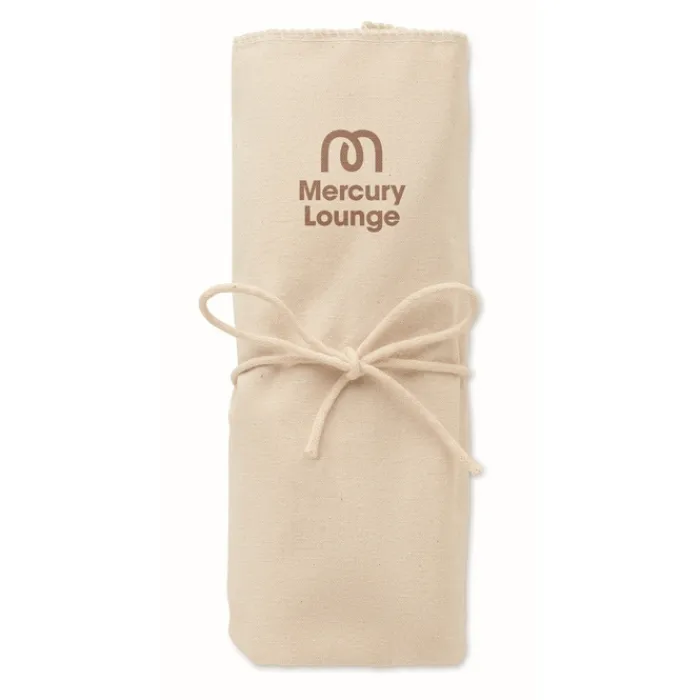 Kit da cocktail in sacchetto di cotone da 220 g/m² con chiusura a cordoncino. Include 5 accessori in acciaio e legno: un misurino a doppia faccia da 15 e 30 ml, un pestello in legno, un colino da cocktail, un agitatore per bevande e un cavatappi da cameriere.