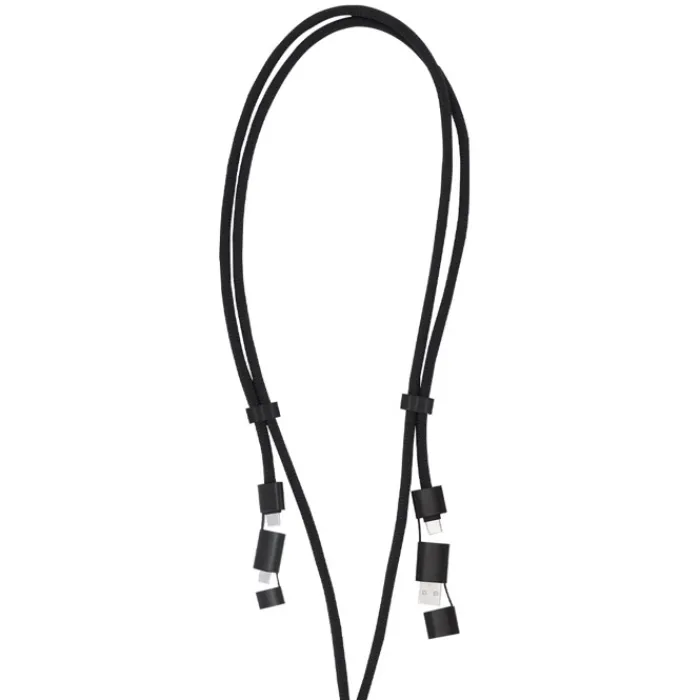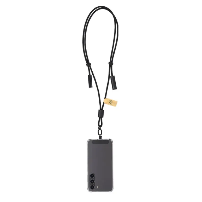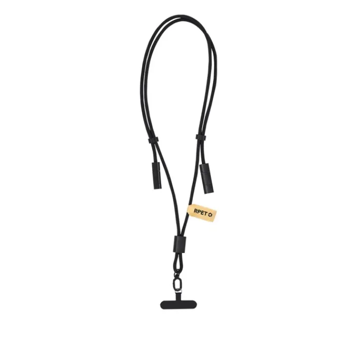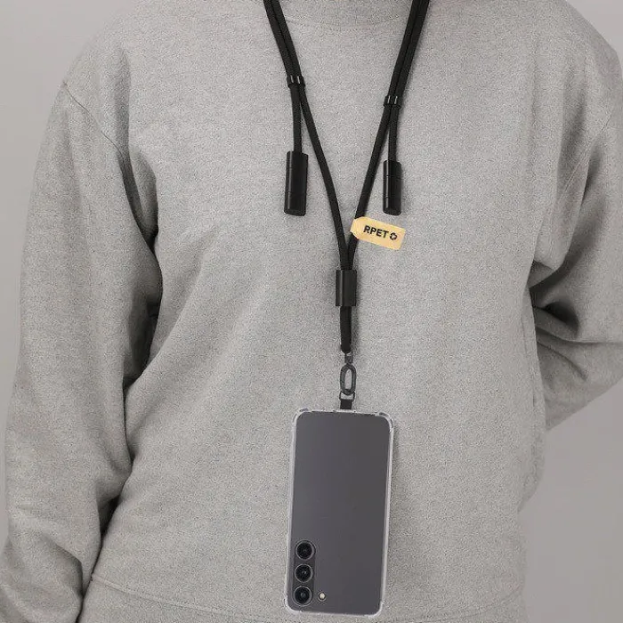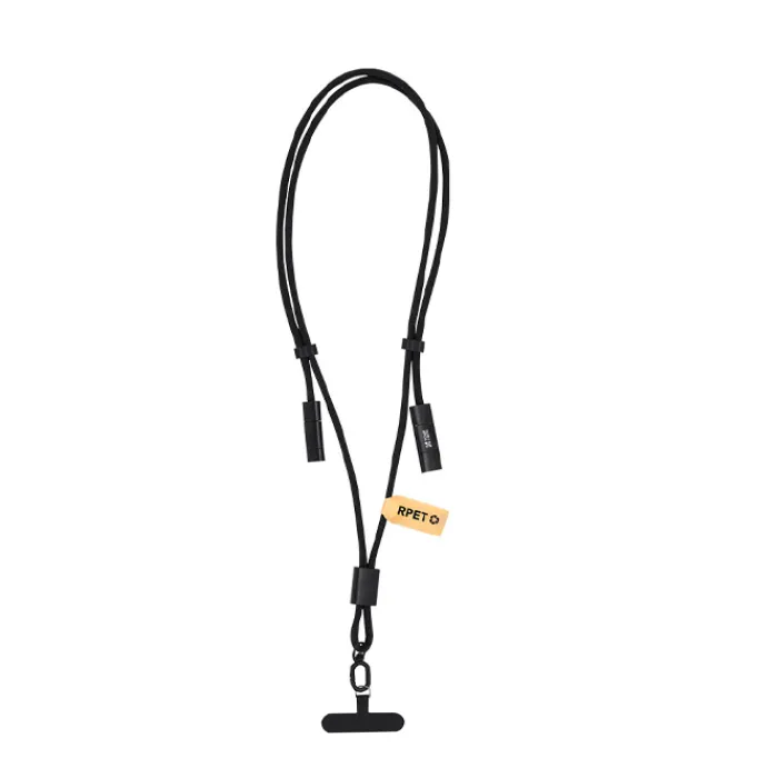 Innovativo lanyard con funzione di supporto e cavo caricatore, realizzato in una combinazione di poliestere RPET e alluminio riciclato. Progettato per essere facilmente posizionato tra la custodia e lo smartphone grazie al suo accessorio di trasporto. Include nastro coordinato, moschettone girevole in metallo nero e accessorio di sicurezza per il collo. Offre funzionalità di ricarica e trasferimento dati, con ingresso USB e di tipo C, e uscite Micro USB, Lightning e di tipo C. Presenta un distintivo di RPET su etichetta kraft, evidenziando il suo impegno sostenibile.Il materiale RPET è realizzato a partire da plastica riciclata, per così incoraggiare il riutilizzo dei rifiuti plastici e contribuire alla sostenibilità del pianeta.L’alluminio riciclato è un materiale con possibilità di riciclaggio quasi infinite, senza perdere le sue proprietà originali e consumando meno energia in questo processo.Certificazione GRS (Global Recycled Standard / Standard di Riciclaggio Globale), che garantisce l’origine riciclata del materiale usato per fabbricare il prodotto.
