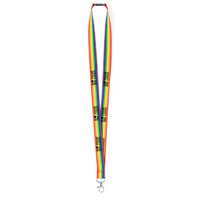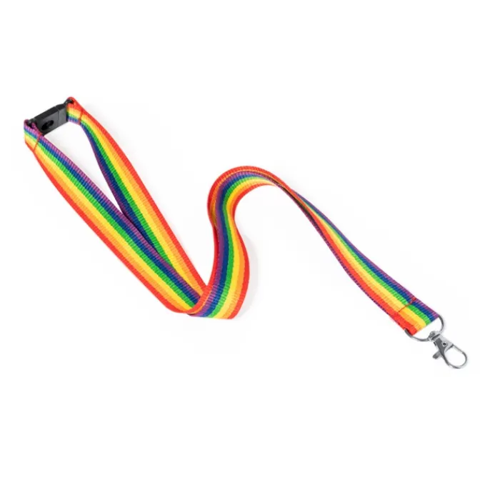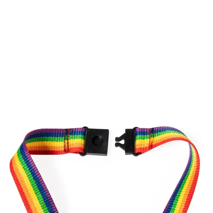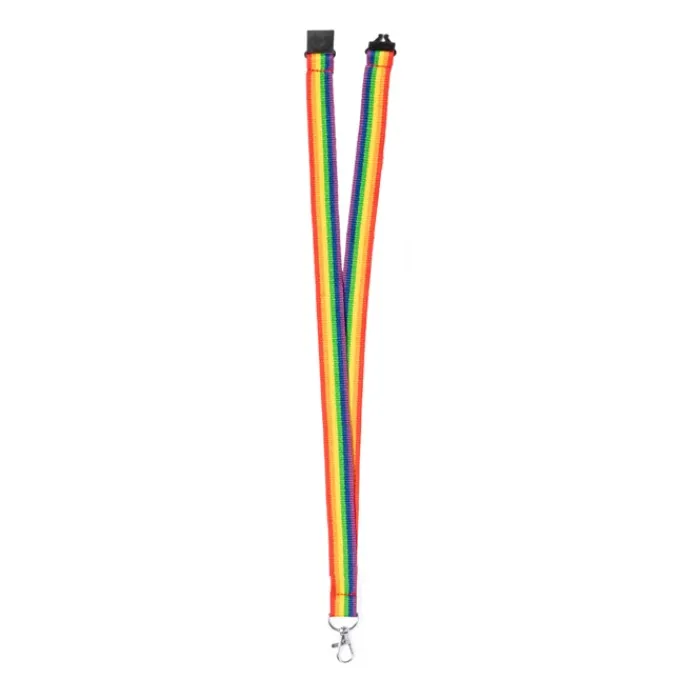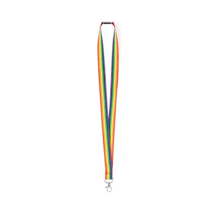 Lanyard multicolore, realizzato in morbido poliestere con trama ad arcobaleno. Con moschettone girevole in metallo e chiusura di sicurezza al collo.