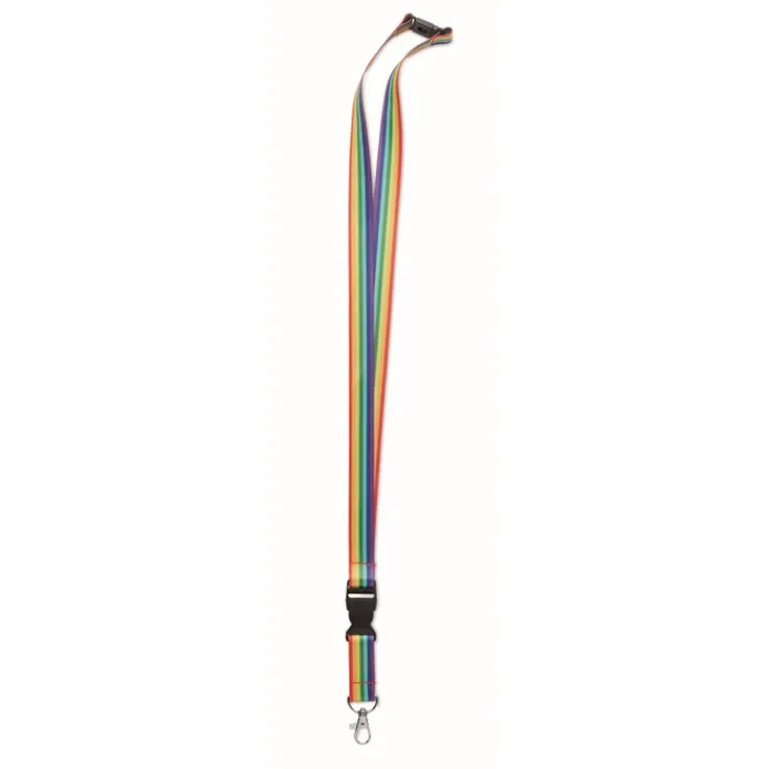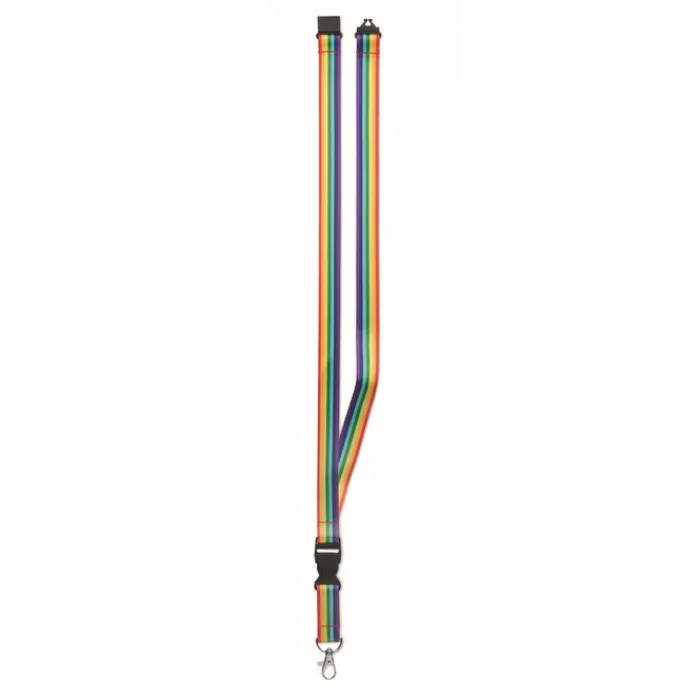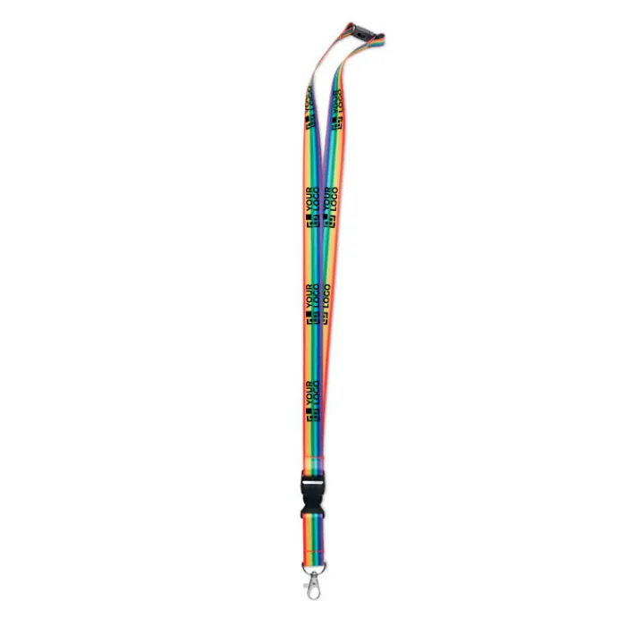 Laccetti da collo personalizzati in RPET con trama ad arcobaleno con chiusura di sicurezza, fibbia a stacco e moschettone in metallo.