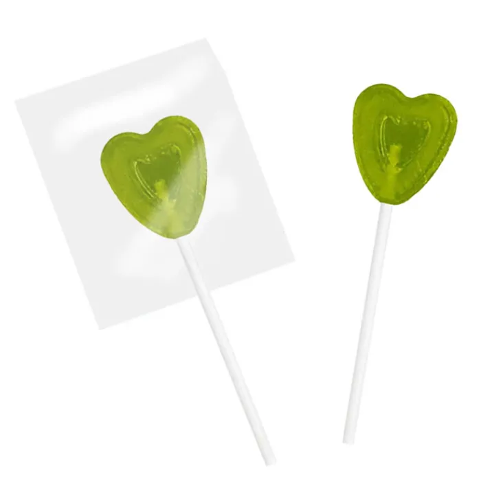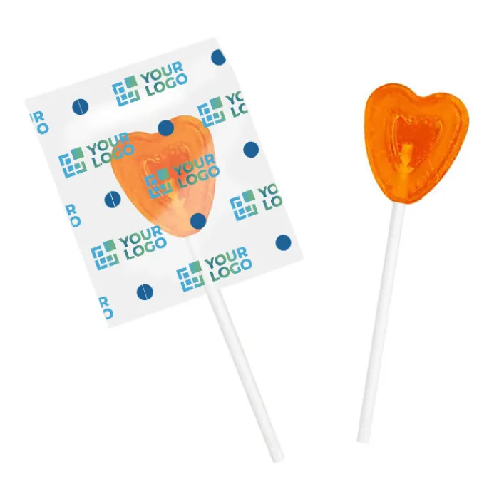 Lecca-lecca piatto, a forma di cuore da 7 grammi con bastoncino di carta e confezione quadrata trasparente riciclabile e personalizzabile. Sapori disponibili: fragola, mela, arancia, limone, ciliegia, lampone, lampone acido, menta e cocacola.