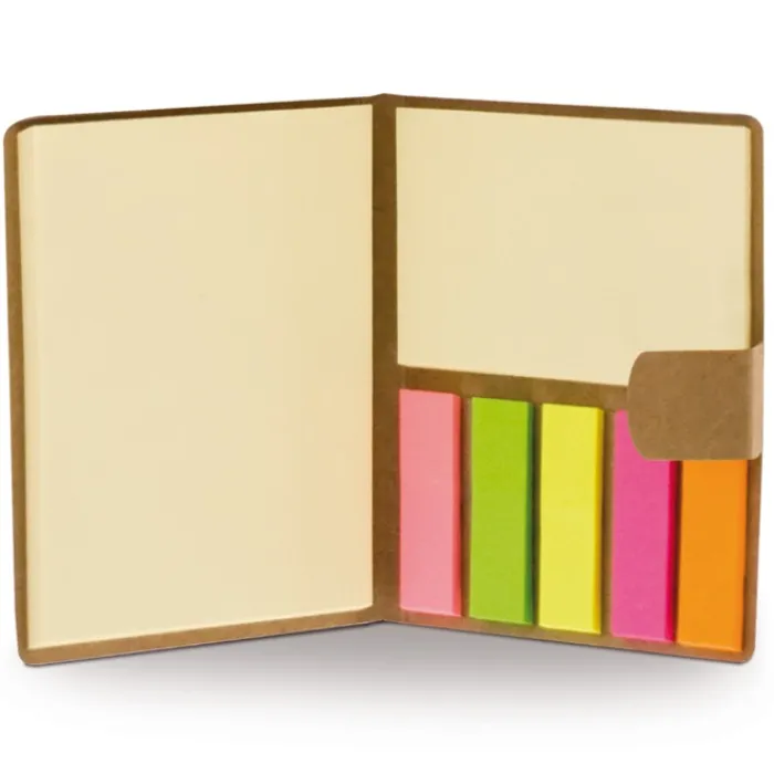Piccolo blocchetto disponibile in marrone bianco o nero con memo adesivi. La versione bianca e marrone ha i memo adesivi gialli, quella nera con memo adesivi bianchi. Contiene un blocchetto da 50 fogliettini da 100×75, un blocchetto da 25 foglietti da 50×75 e 5×25 segnapagina adesivi colorati.