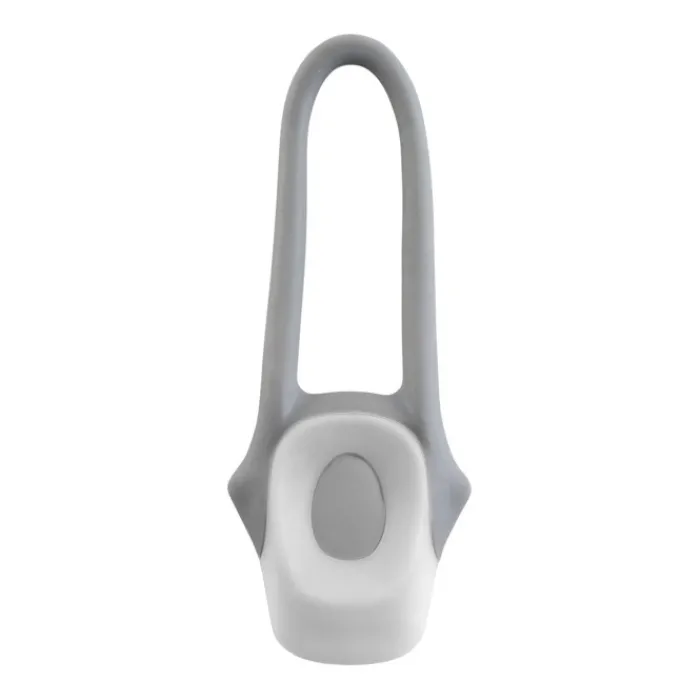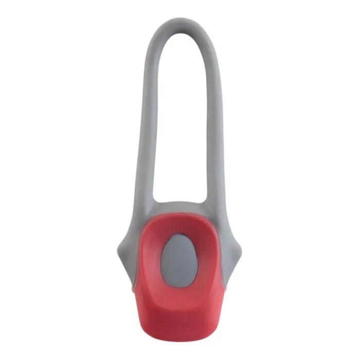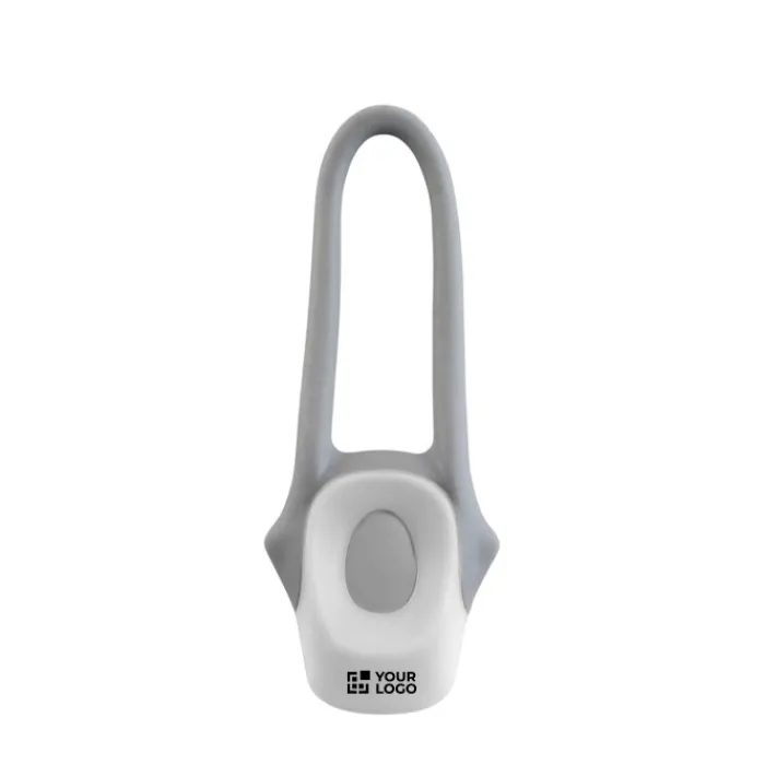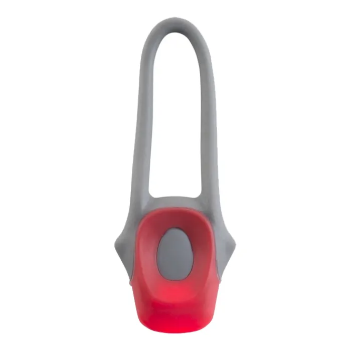 Luce per bicicletta in plastica con 2 LED e cinturino in silicone per fissaggio. Luce fissa e ad intermittenza. Pulsante on/off. Batterie incluse.