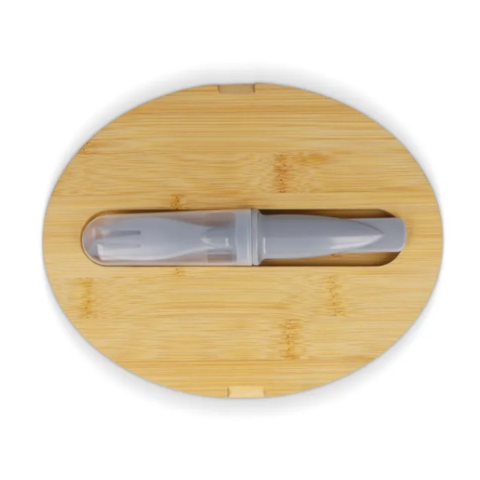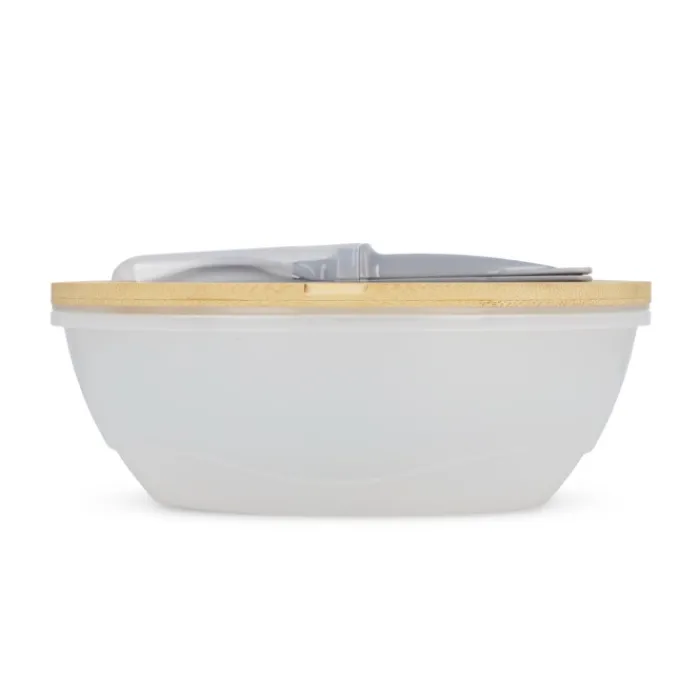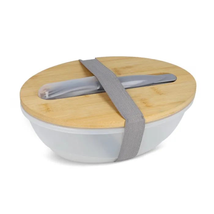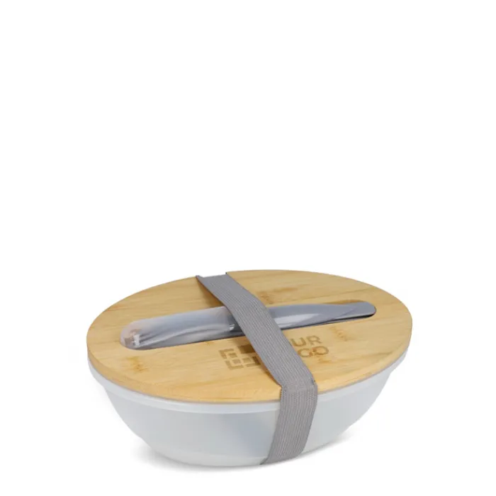 Lunch box realizzato in polipropilene riciclato (PP) e bambù. Include un set di posate e una chiusura elastica in poliestere conveniente. Una scelta sostenibile per i tuoi pasti da portare con te.