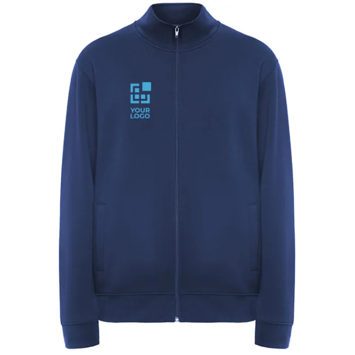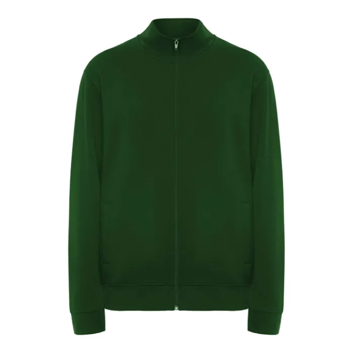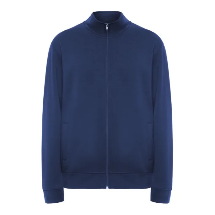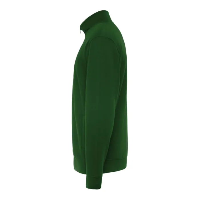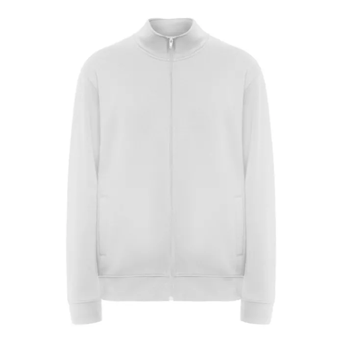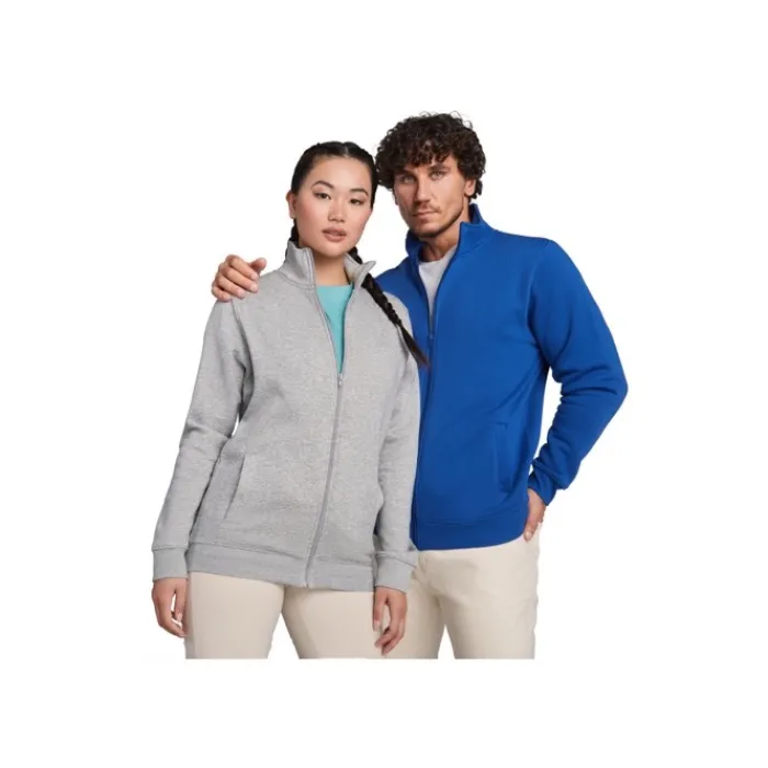 Maglioncino unisex a collo alto con cerniera abbinata. Colletto interno abbinato con copri cuciture rinforzate. Polsini e giro vita in tessuto a costine 1×1. Etichetta rimovibile. Tessuto 50% Cotone e 50% Poliestere, 280 g/m². Il modello nella foto è alto 185 cm ed indossa una taglia L, mentre la modella è alta 168 cm ed indossa una taglia M.