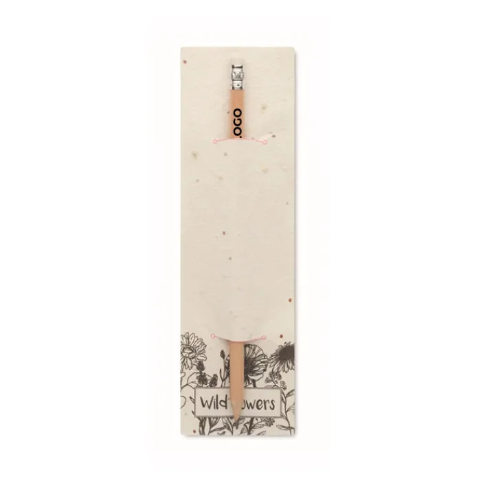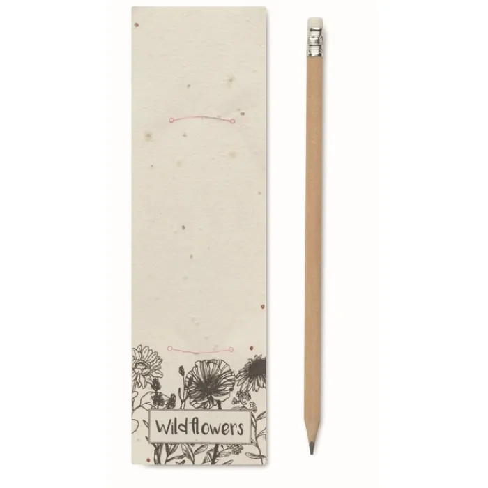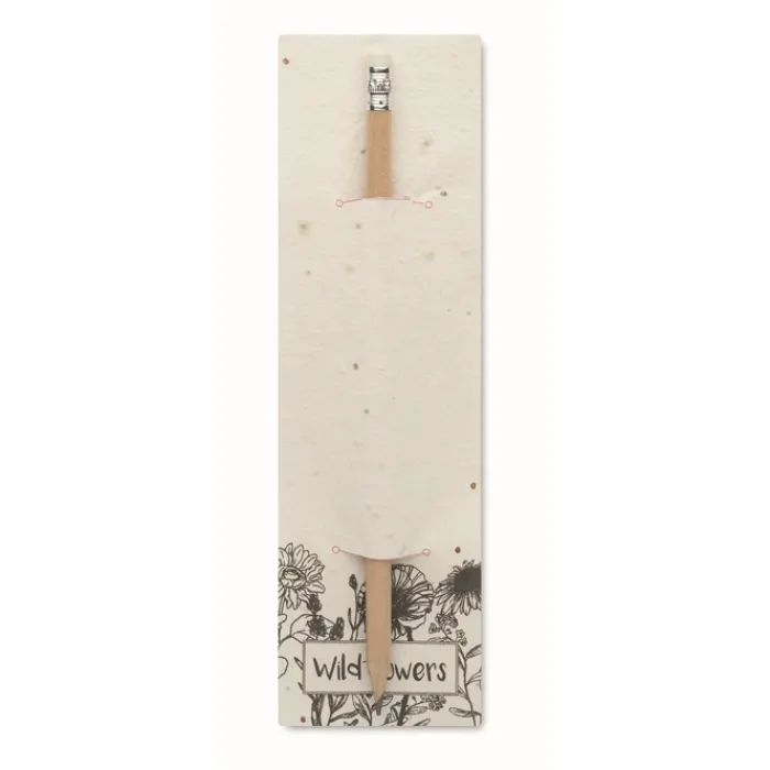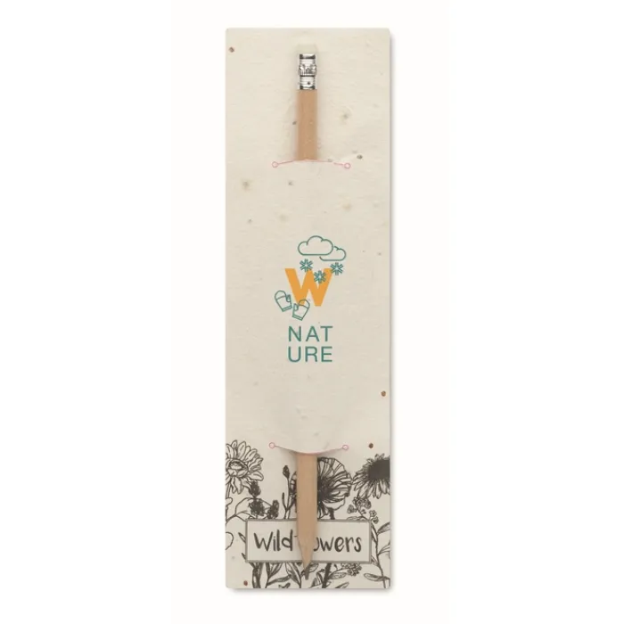 Matita in legno naturale con gomma da cancellare. Presentata in una confezione di carta contenente semi di fiori selvatici, che quindi si può piantare.