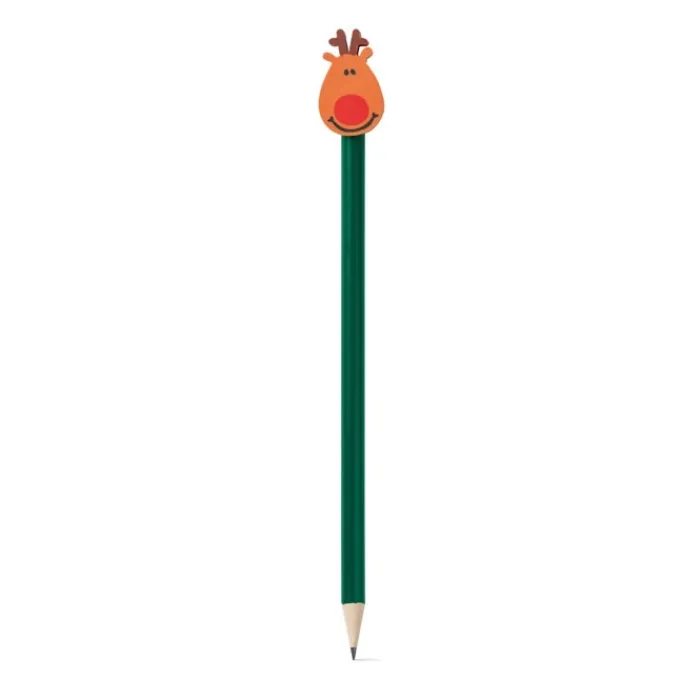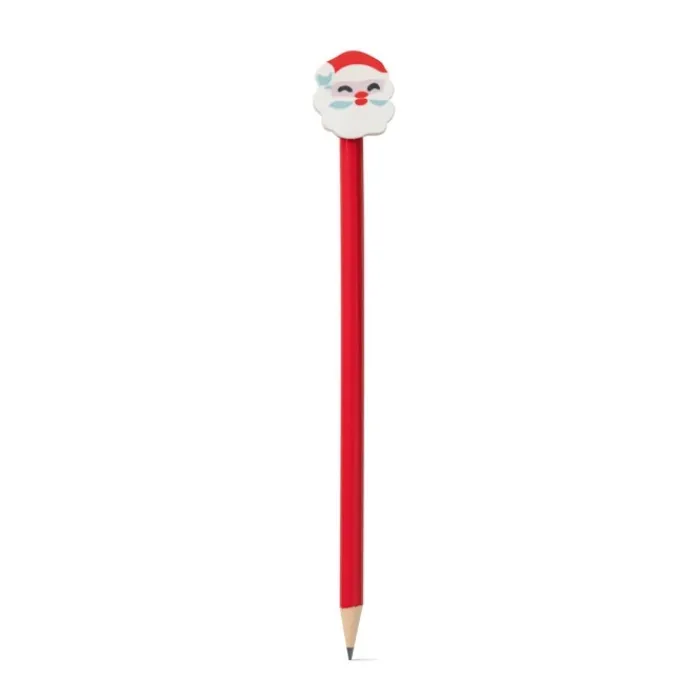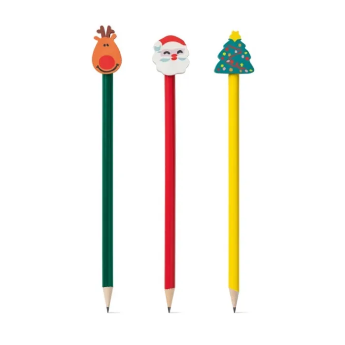 Matita fornita temperata con gomma da cancellare disponibile in 3 forme differenti a seconda del colore: renna (verde), albero di Natale (gialla) e Babbo Natale (rossa).