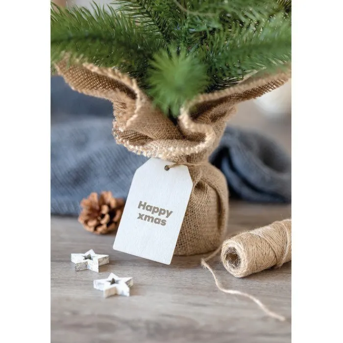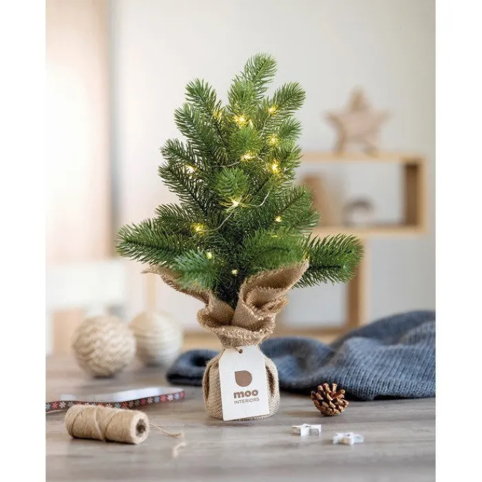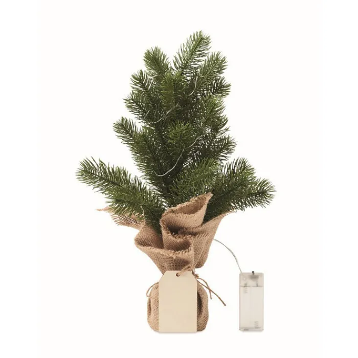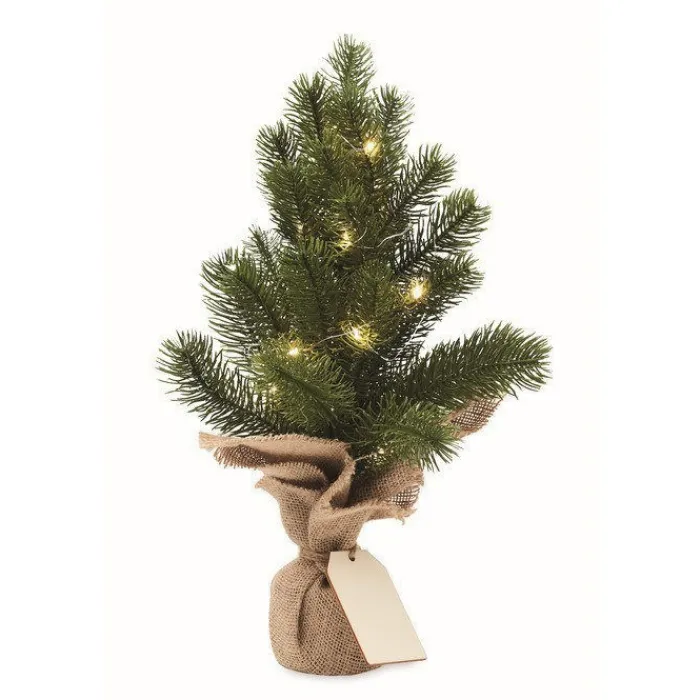 Mini albero di Natale finto, realizzato in plastica PP contenuto in un sacchetto di iuta. Include 20 lucine a LED gialle. Viene fornito con un’etichetta regalo in legno personalizzabile. Funziona con 2 batterie AA non incluse.