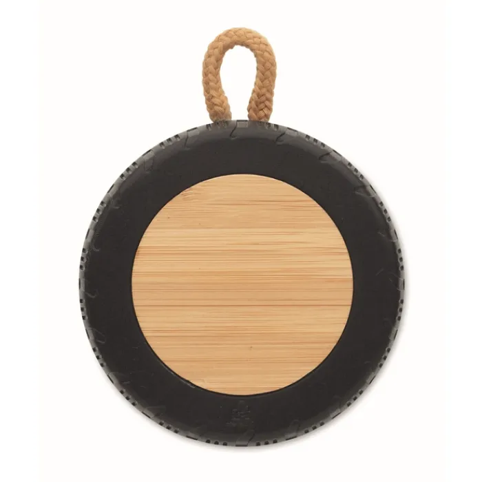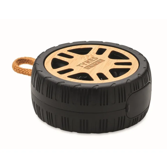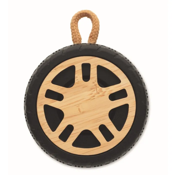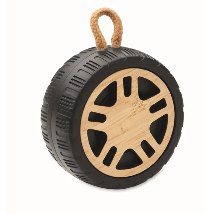 Speaker wireless 5.3 a forma di pneumatico in ABS riciclato con dettagli in bambù e piccolo manico in corda di cotone. Batteria ricaricabile da 300 mAh.