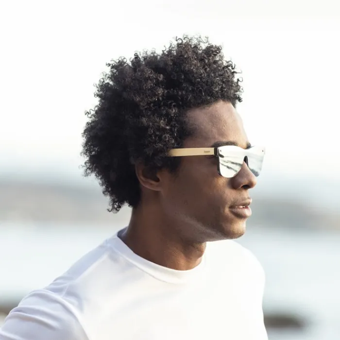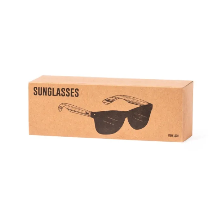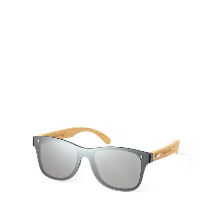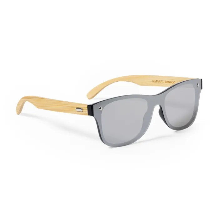 Occhiali da sole della linea Nature con protezione UV400. Montatura nera in resistente materiale PC, con lenti effetto specchio e aste in bambù naturale. Confezionati in un attraente astuccio di eco-design.