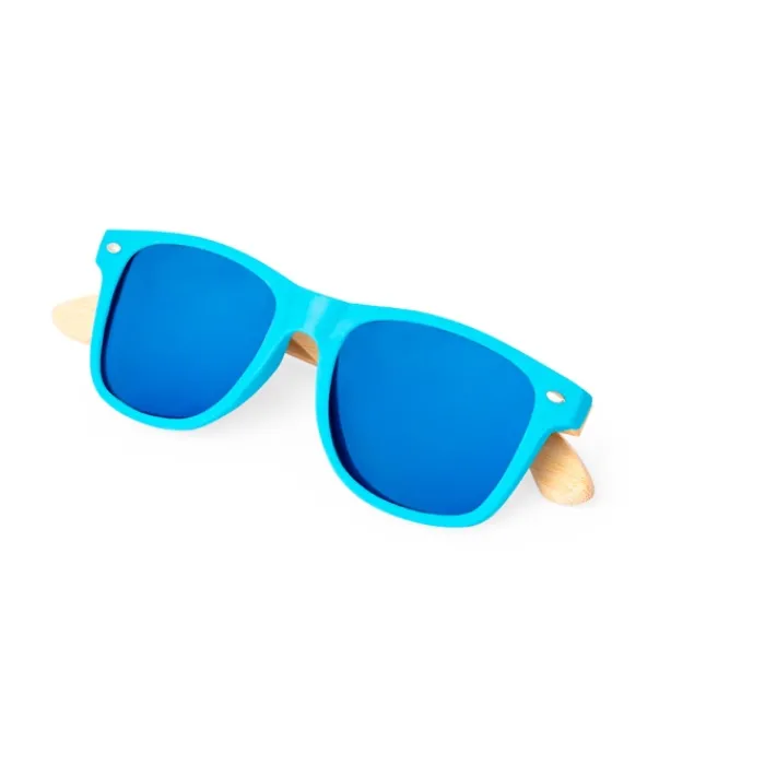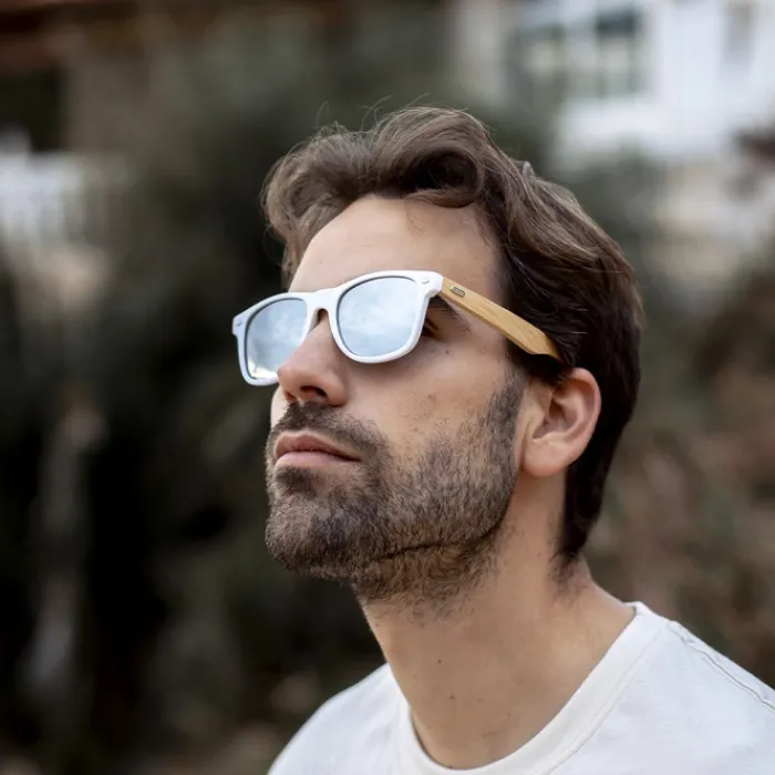 Occhiali da sole in bambù con protezione UV400. Montatura colorata in resistente materiale PC e stanghette in bambù. Presenta lenti in AC (acetato di cellulosa) con finitura a specchio, disponibili in un’ampia gamma di colori in abbinamento alla montatura. Presentati in un attraente polybag dal design kraft. Materiali come il bambù favoriscono l’utilizzo di materie prime naturali, riducendo le emissioni inquinanti. Proviene da una pianta di grande resistenza e versatilità, con rapida crescita e rigenerazione, costituendo un’ottima alternativa all’uso del legno tradizionale.
