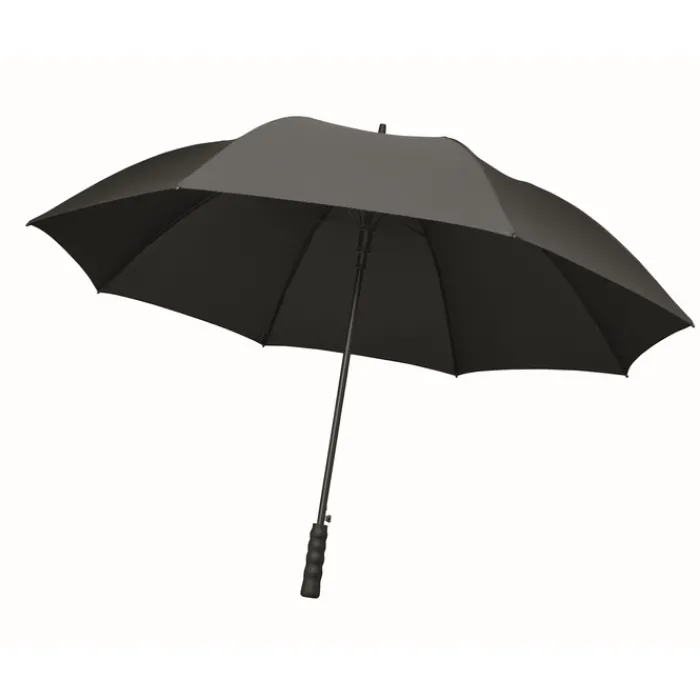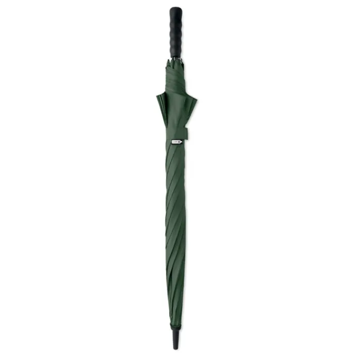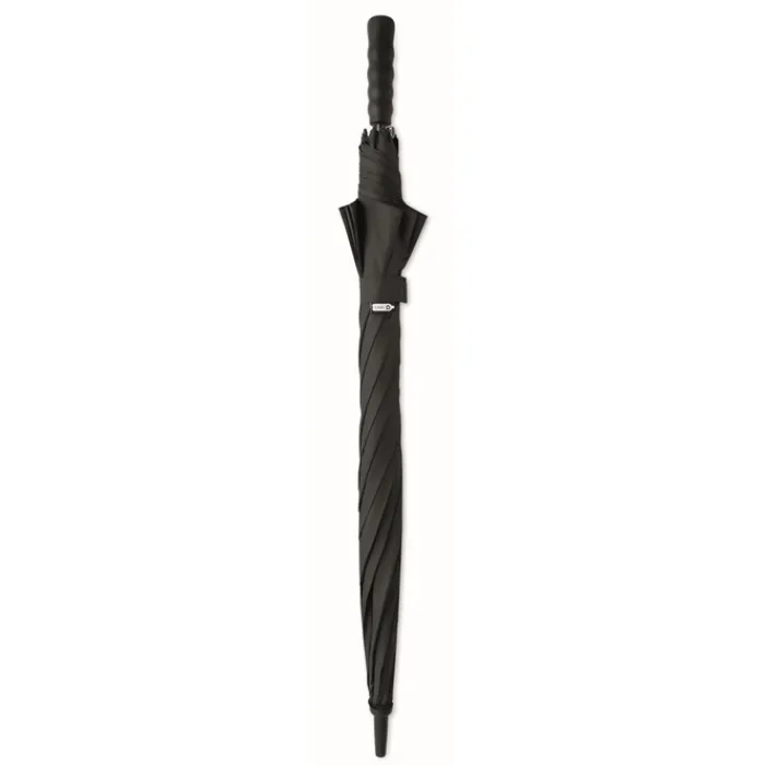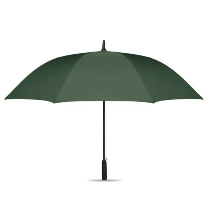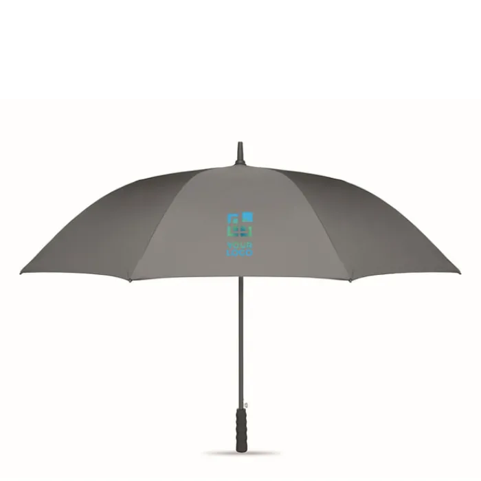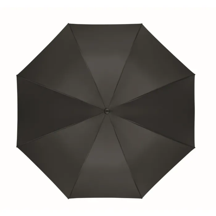 Ombrello antivento da 27″” con apertura automatica in pongee rPET 190T. Asta e stecche in fibra di vetro. Manico in paglia di grano e ABS riciclato. Punte e parte superiore in plastica.