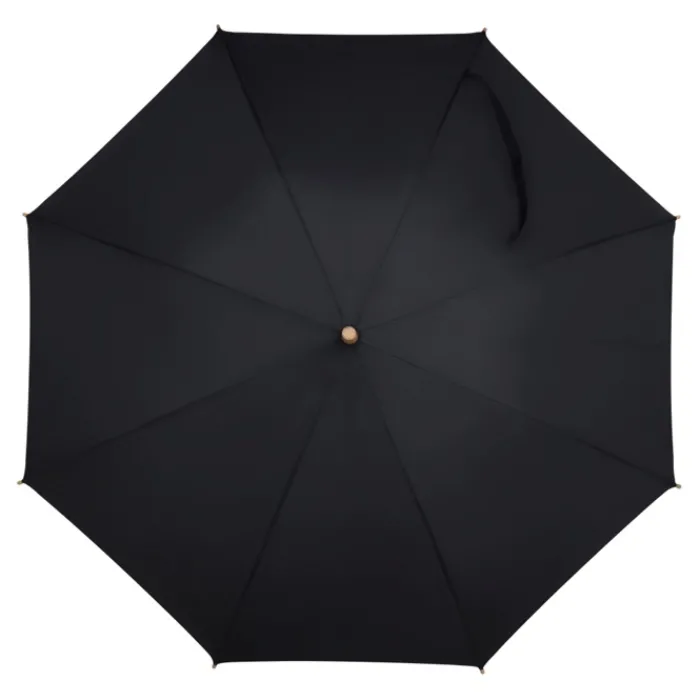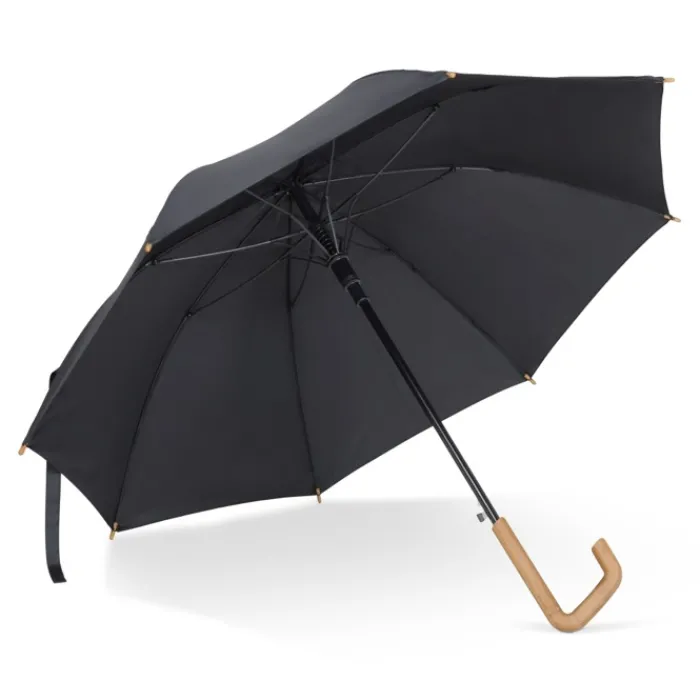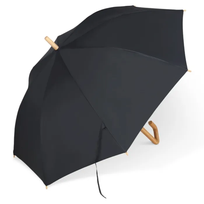 Ombrello da 23″ realizzato in rPET con manico geometrico in legno dal design esclusivo. Grazie al telaio in fibra di vetro, è a prova di tempesta. Le punte sono in bambù e l’asta è in metallo per un migliore riciclaggio e il materiale misto conferisce all’ombrello un aspetto lussuoso (il nero è in tinta unita).