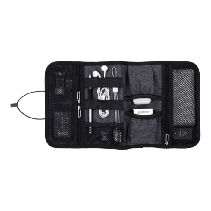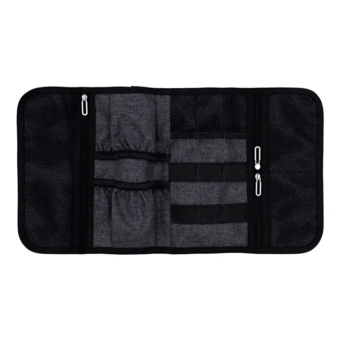 L’organizer da viaggio è il compagno perfetto per mantenere organizzati i tuoi dispositivi digitali e accessori tecnologici essenziali di uso quotidiano, consentendoti di riporre anche gli accessori da viaggio. Realizzato in poliestere 600D di alta qualità, resistente all’acqua e alle macchie, il suo design compatto lo rende facile da riporre in borsa, zaino o valigia. La pratica struttura include 6 passanti elastici per cavi e strumenti, 3 tasche in rete per piccoli oggetti come USB o schede SD e 2 tasche aperte per caricabatterie o adattatori, offrendo grande flessibilità e uno spazio interno regolabile.