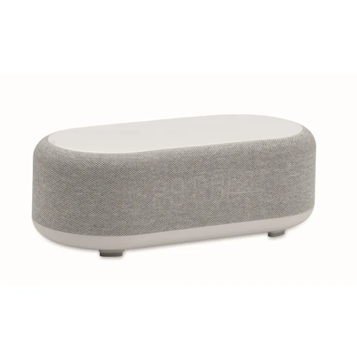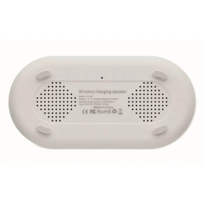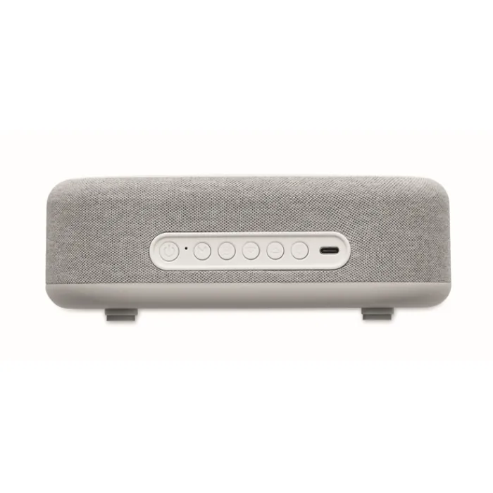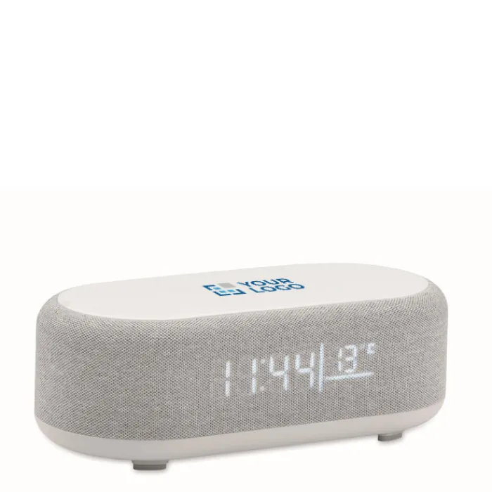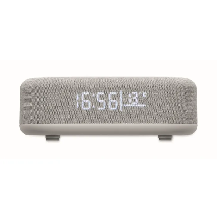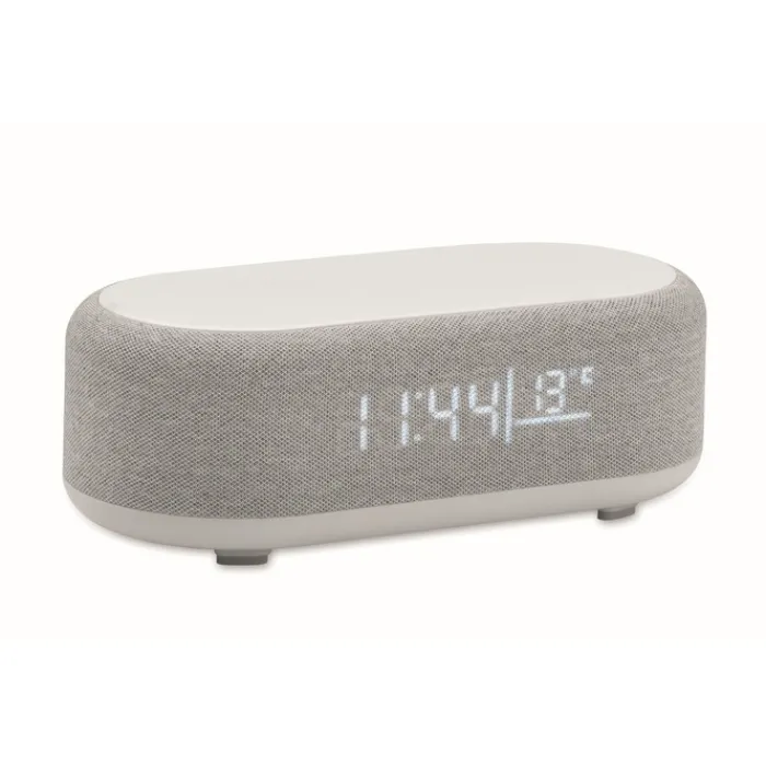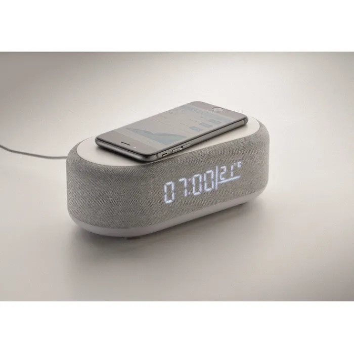 Orologio da tavolo in ABS con stazione meteorologica, luce ambientale e funzione sveglia. Include, inoltre, un altoparlante da 15 W e caricatore wireless da 5 W sulla parte superiore. Batteria Li-Ion integrata da 1.200 mAh. Durata della riproduzione: circa 7 ore. Conforme alla normativa ROHS.