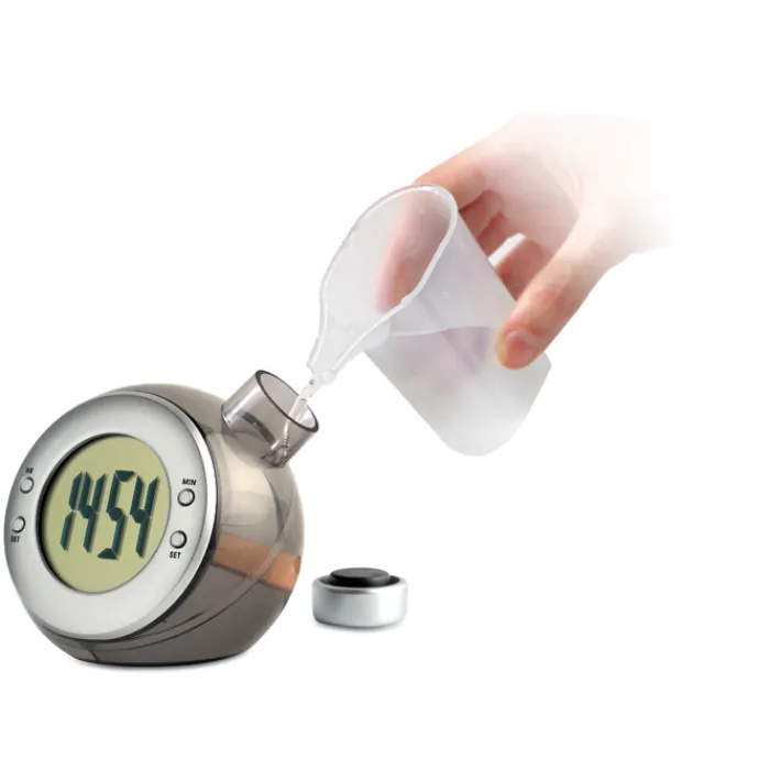 Orologio digitale da tavolo con display LCD alimentato ad acqua o da qualsiasi altro liquido.