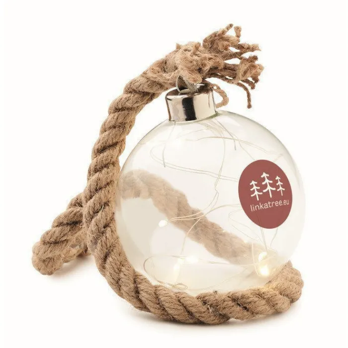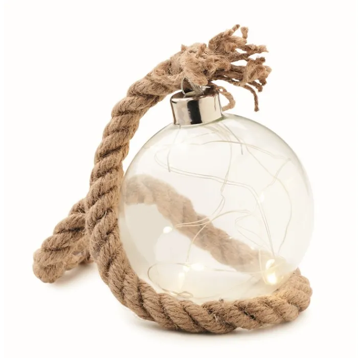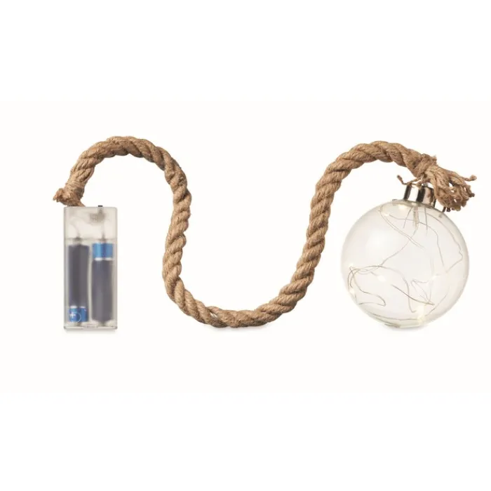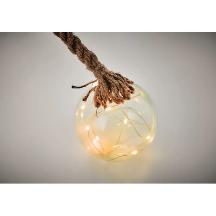 Pallina in vetro con stringa di 8 luci a LED gialle con corda di iuta. Funziona con 2 batterie AA non incluse.