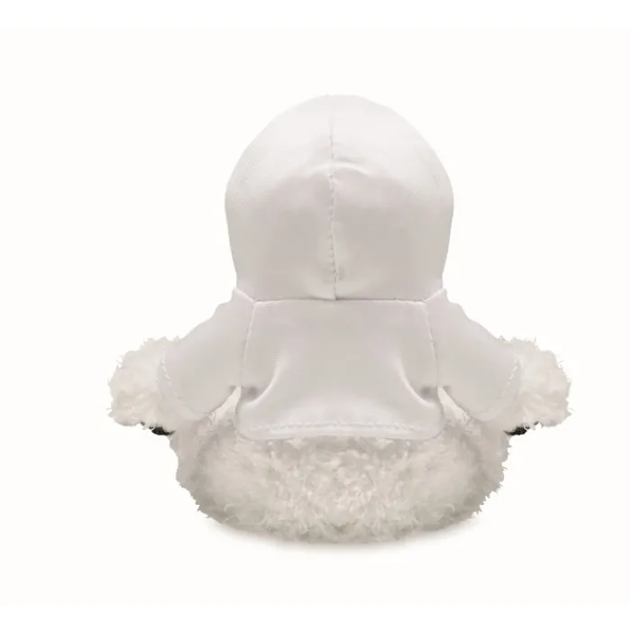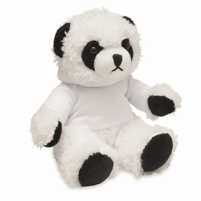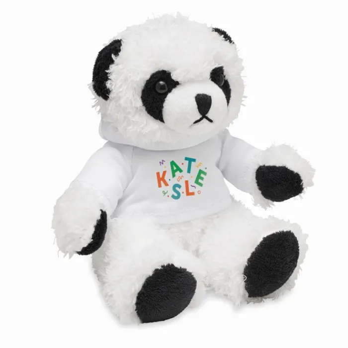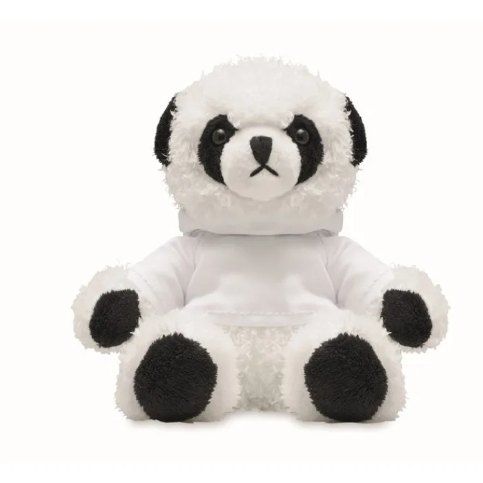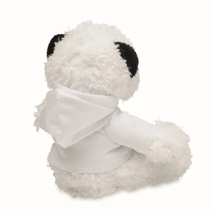 Peluche a forma di panda che indossa una felpa con cappuccio personalizzabile con la stampa in sublimazione.