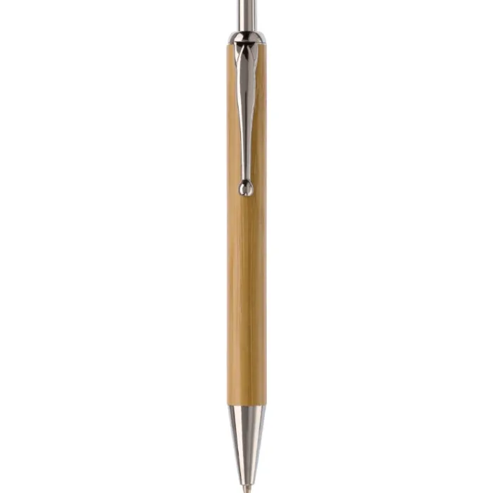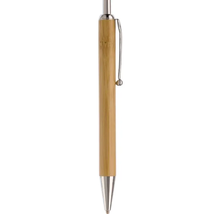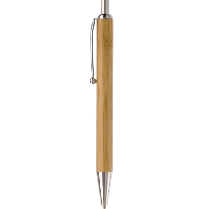 Penna a sfera in bambù con clip in metallo e punta metallizzata. Inchiostro nero.