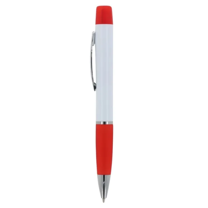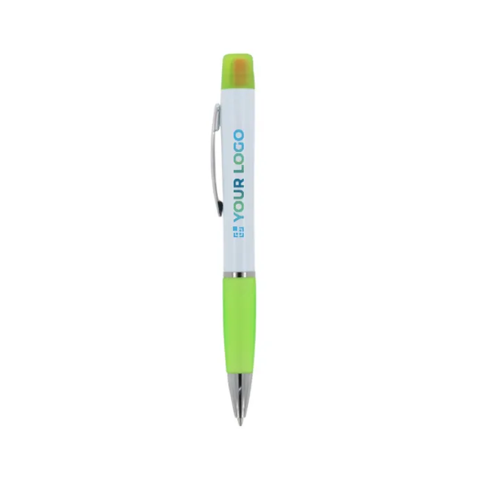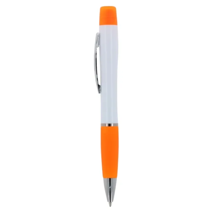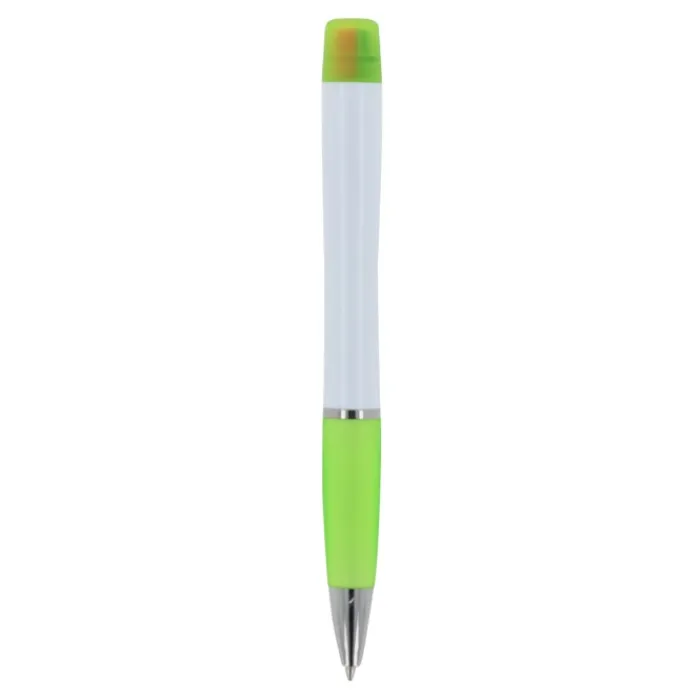 Penna a sfera di plastica ABS con fusto bianco e impugnatura colorata. Inchiostro blu. Sulla testa presenta un mix di tre evidenziatori: giallo, rosa e arancione.