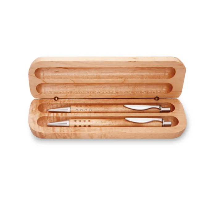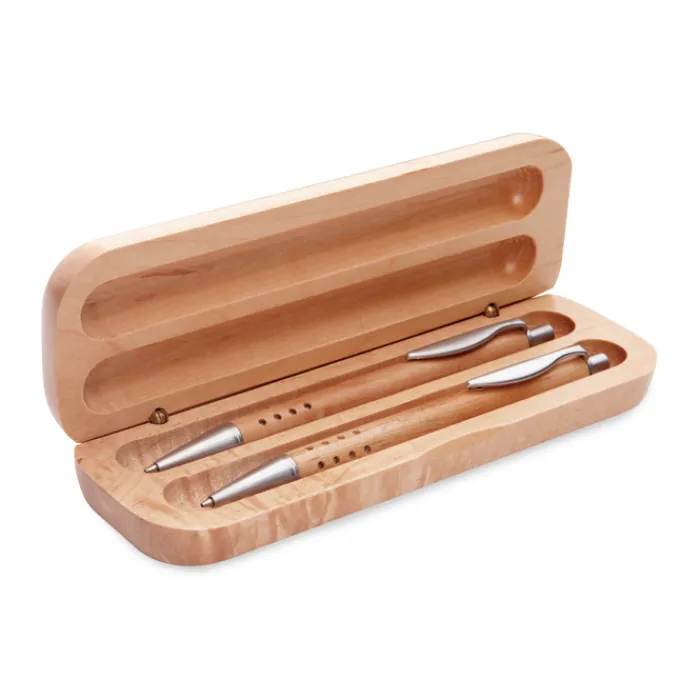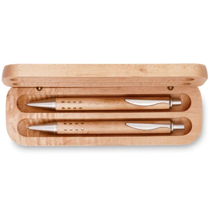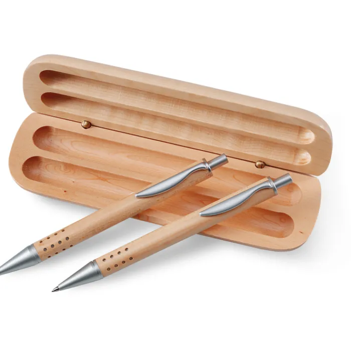Set composto da una penna a sfera e una matita a mine con meccanismo a scatto in confezione di legno. Inchiostro nero.