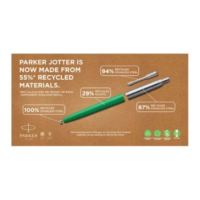 Penna a sfera Parker Jotter Recycled con un fusto in plastica riciclata antigraffio, elegante e durevole. L’anello e la clip realizzati in acciaio inossidabile riciclato ne esaltano il fascino ecologico. Comprende una ricarica Parker Quinkflow® con inchiostro nero per un’esperienza di scrittura fluida.