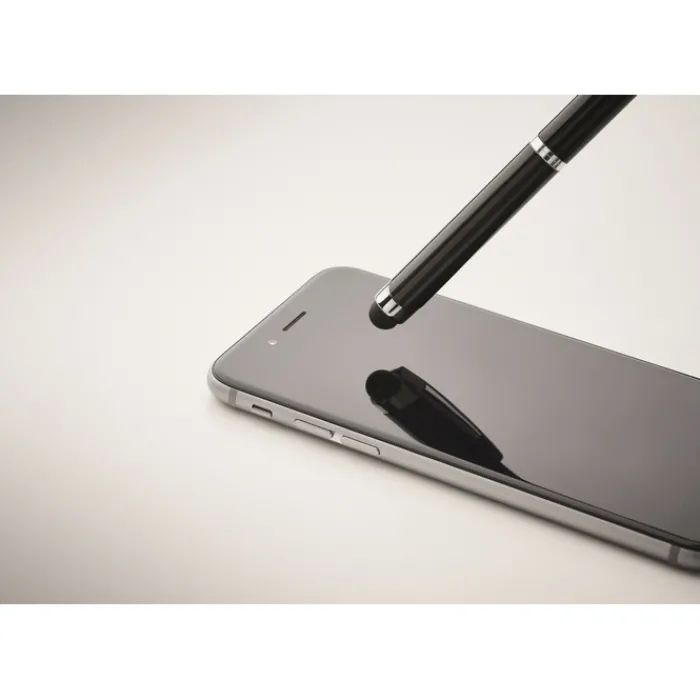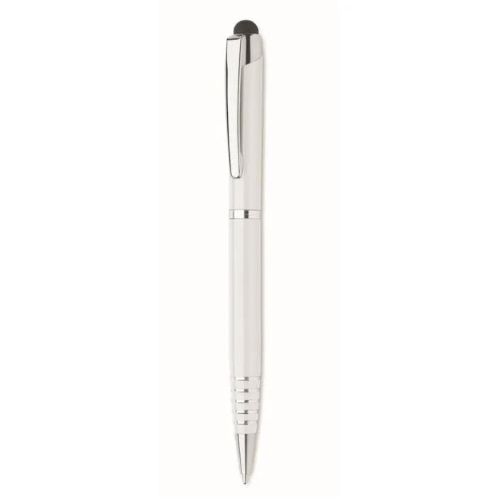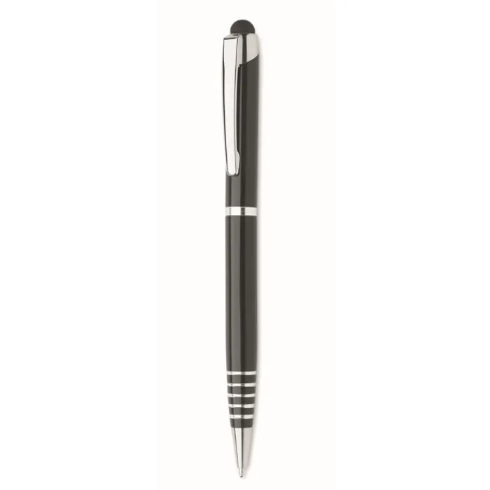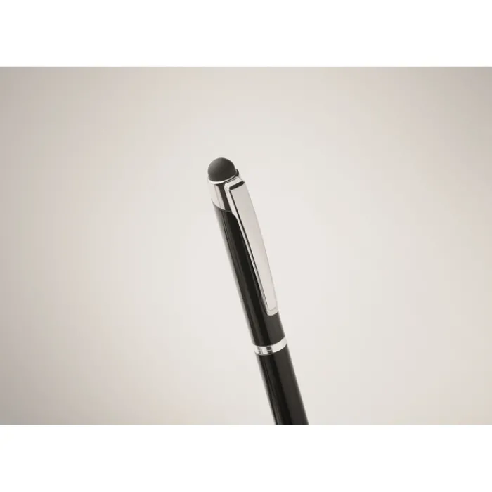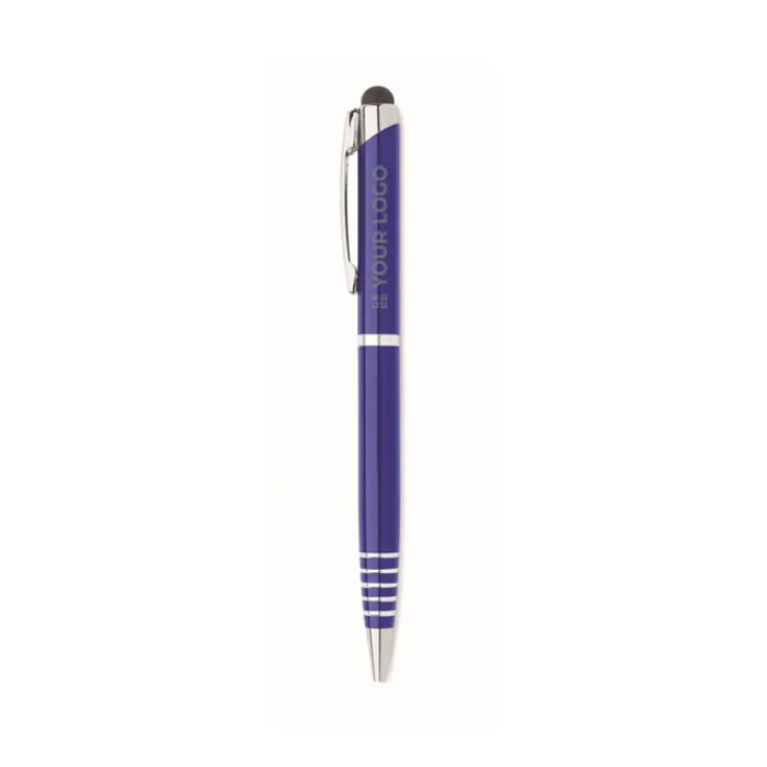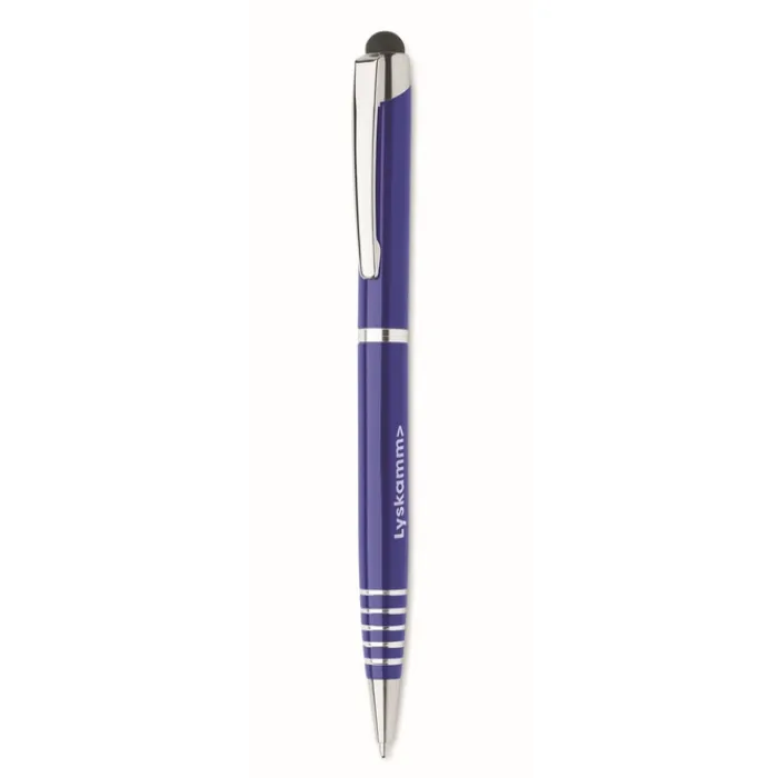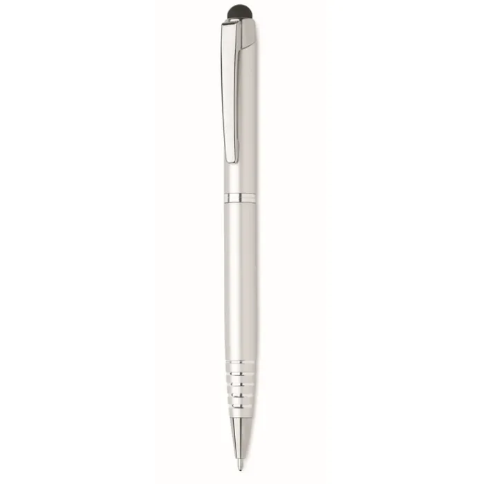 Penna a sfera con meccanismo twist e gommino touchscreen realizzata in alluminio riciclato. Inchiostro blu.